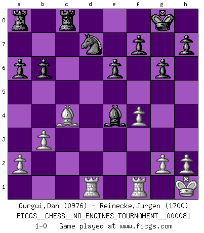 Last move : 1-0 2016 March 2 5:27:40 [Event "FICGS__CHESS__NO_ENGINES_TOURNAMENT__000081"] [Site "FICGS"] [Date "2015.10.06"] [Round "1"] [White "Gurgui,Dan"] [Black "Reinecke,Jurgen"] [Result "1-0"] [WhiteElo "0976"] [BlackElo "1700"] 1.d4 Nf6 2.c4 e6 3.Nc3 Bb4 4.Bd2 c5 5.dxc5 Bxc5 6.e3 O-O 7.Bd3 a6 8.Nge2 b6 9.b3 Bb7 10.O-O d5 11.cxd5 Nxd5 12.Na4 Be7 13.Nac3 Nxc3 14.Bxc3 Bf6 15.Qc2 g6 16.Nd4 Qd5 17.e4 Qd8 18.f4 Bxd4+ 19.Bxd4 Qxd4+ 20.Kh1 Rc8 21.Qe2 Nd7 22.Bc4 Qxe4 23.Qxe4 Bxe4 24.Rad1 1-0 Nimzo-Indian defense Kingside Castling by player Black (move 6) Kingside Castling by player White (move 10) Player White won this chess game. Follow this game move after move (download)The game of chess is the touchstone of the intellect. (Goethe) Ich erzeugte keinen Neid, da mich die Schachspieler als Musiker und die Musiker als Schachspieler betrachteten. (Mark Taimanov) A la fecha, Fischer esta simplemente un nivel arriba de todos los mejores jugadores de Ajedrez del mundo. (John Jacobs) J'apprécie les joueurs d'est-indienne, c'est grâce à eux que je nourris ma famille depuis tant d'années. (Petrosian) We need strong personalities and only one world champion to attract sponsors. (Anatoly Karpov)