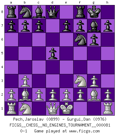 Last move : 0-1 2015 November 17 10:47:43 [Event "FICGS__CHESS__NO_ENGINES_TOURNAMENT__000081"] [Site "FICGS"] [Date "2015.10.06"] [Round "1"] [White "Pech,Jaroslav"] [Black "Gurgui,Dan"] [Result "0-1"] [WhiteElo "0899"] [BlackElo "0976"] 1.Nf3 Nf6 2.b3 g6 3.Bb2 Bg7 4.g3 O-O 5.Bg2 d5 0-1 Reti Opening Kingside Castling by player Black (move 4) Player Black won this chess game. Follow this game move after move (download)What would Chess be without silly mistakes ? (Kurt Richter) Es hat in meinem Leben Zeiten gegeben, da ich sehr nahe daran war zu glauben, daß ich auch nicht eine einzige Schachpartie verlieren könnte. (José Raúl Capablanca) En manos de Fischer's, una diminuta ventaja teórica es tan buena como tener una Reina de ventaja. (Isaac Kashdan) Vous n'êtes pas toujours obligé de jouer le meilleur coup. Un coup doit être actif, entreprenant, correct et beau ! (David Bronstein) Creativity is allowing yourself to make mistakes. Art is knowing which ones to keep. (Scott Adams)