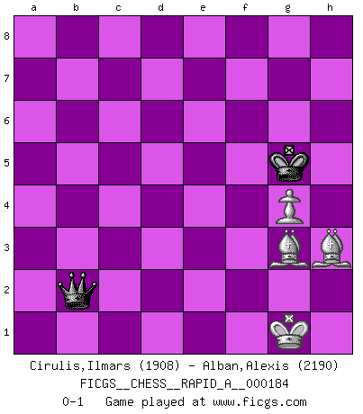Last move : 0-1 2015 October 23 19:31:47 [Event "FICGS__CHESS__RAPID_A__000184"] [Site "FICGS"] [Date "2015.10.08"] [Round "1"] [White "Cirulis,Ilmars"] [Black "Alban,Alexis"] [Result "0-1"] [WhiteElo "1908"] [BlackElo "2190"] 1.b4 d5 2.Bb2 Nf6 3.Nf3 e5 4.Nxe5 Bxb4 5.c4 O-O 6.cxd5 Qxd5 7.Nd3 Be7 8.Nc3 Qd6 9.e3 Nc6 10.Nb5 Qd8 11.Be2 Bf5 12.Nf4 a6 13.Nc3 Bd6 14.g4 Bxg4 15.Bxg4 Bxf4 16.exf4 Re8+ 17.Be2 Nh5 18.O-O Nxf4 19.Bf3 Ne5 20.d4 Ned3 21.Bc1 Nh3+ 22.Kg2 Qxd4 23.Kxh3 Qxc3 24.Be3 Rad8 25.Kg2 Nxf2 26.Bxf2 Rxd1 27.Raxd1 b5 28.Bd5 Qc2 29.Kh1 Re5 30.Rc1 Qd3 31.Bg2 Re2 32.Rxc7 h5 33.Rc8+ Kh7 34.Rc5 Rxa2 35.Re5 Re2 36.Rxh5+ Kg8 37.Rd5 Qc2 38.Rc5 Qd2 39.Rd5 Qa2 40.Kg1 Rd2 41.Re5 f6 42.Rc5 Qe6 43.Rc6 Rd6 44.Bh3 Qe5 45.Rc5 Rd5 46.Rc6 Qg5+ 47.Bg2 b4 48.Bh4 Qg6 49.Bg3 Rd8 50.Bh3 Qd3 51.Be6+ Kh8 52.Re1 a5 53.Rc5 g6 54.Rxa5 Qf3 55.Bh3 Rd1 56.Rxd1 Qxd1+ 57.Bf1 b3 58.Rb5 Qc2 59.Bf2 b2 60.Bd4 b1Q 61.Bxf6+ Kg8 62.Rxb1 Qxb1 63.Bh4 Kf7 64.Bg3 g5 65.Kg2 Qc2+ 66.Kg1 Kg6 67.h3 g4 68.hxg4 Kg5 69.Bh3 Qb2 0-1 Polish (Sokolsky) opening Kingside Castling by player Black (move 5) Kingside Castling by player White (move 18) 10 pieces endgame at move 56 : White KRBBP , Black KQPPP WHITE : King + 1 Rook 2 Bishops 1 Pawn BLACK : King + 1 Queen 3 Pawns Promotion Queen by player Black (move 60) 9 pieces endgame at move 61 : White KRBBP , Black KQQP WHITE : King + 1 Rook 2 Bishops 1 Pawn BLACK : King + 2 Queens 1 Pawn 8 pieces endgame at move 62 : White KRBBP , Black KQP WHITE : King + 1 Rook 2 Bishops 1 Pawn BLACK : King + 1 Queen 1 Pawn 7 pieces endgame at move 62 : White KBBP , Black KQP WHITE : King + 2 Bishops 1 Pawn BLACK : King + 1 Queen 1 Pawn 6 pieces endgame at move 68 : White KBBP , Black KQ WHITE : King + 2 Bishops 1 Pawn BLACK : King + 1 Queen Player Black won this chess game. Follow this game move after move (download)I love all positions. Give me a difficult positional game, I will play it. But totally won positions, I cannot stand them. (Hein Donner) Fischer ist das größte Genie, das je vom Schachhimmel heruntergestiegen ist. (Mikhail Nekhemyevich Tal) Cuando tengas duda... ¡juega al Ajedrez!. (Tevis) Aux échecs, les retours au sommet sont rares : les dommages psychologiques consécutifs à une défaite sont trop sévères. (Daily Telegraph) There are lots of people who mistake their imagination for their memory. (Josh Bilings)