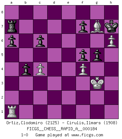 Last move : 1-0 2015 October 20 16:6:31 [Event "FICGS__CHESS__RAPID_A__000184"] [Site "FICGS"] [Date "2015.10.08"] [Round "1"] [White "Ortiz,Clodomiro"] [Black "Cirulis,Ilmars"] [Result "1-0"] [WhiteElo "2125"] [BlackElo "1908"] 1.d4 c6 2.e4 d5 3.Nc3 dxe4 4.Nxe4 Nf6 5.Nxf6+ exf6 6.Nf3 Bd6 7.Be2 O-O 8.O-O Re8 9.c4 Na6 10.Re1 Nc7 11.h3 Bf5 12.Bd3 Rxe1+ 13.Nxe1 Qd7 14.Bxf5 Qxf5 15.Be3 Rd8 16.Qa4 a6 17.Rd1 Ne6 18.Qc2 Qa5 19.Qb3 b5 20.Nf3 Bc7 21.Rc1 g6 22.Kf1 h5 23.g3 Kg7 24.h4 Rd7 25.Kg2 Bb6 26.Qc3 b4 27.Qd3 Qxa2 28.Qe4 Rc7 29.g4 hxg4 30.Qxg4 Qxb2 31.h5 Nxd4 32.Nxd4 Bxd4 33.Qxd4 Qxd4 34.h6+ Kh7 35.Bxd4 f5 36.Ra1 Rd7 37.Bg7 Ra7 38.Kg3 g5 39.f4 1-0 Queen's pawn Kingside Castling by player Black (move 7) Kingside Castling by player White (move 8) Player White won this chess game. Follow this game move after move (download)When I have White, I win because I am white; When I have Black, I win because I am Bogolyubov. (Bogolyubov) Die Fehler sind da, Sie warten nur darauf gemacht zu werden. (Savielly Grigorievitsch Tartakower) La vida es como un juego de Ajedrez, cambiando con cada movimiento. (Proverbio Chino) Les Echecs sont affaire de jugement sensible. Savoir quand frapper et quand esquiver. (Fischer) All the troubles of the world come from being unable to sit alone in a quiet room. (Blaise Pascal)