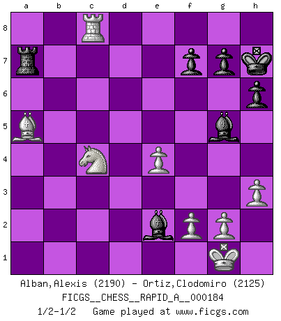 Last move : 1/2-1/2 2015 October 24 18:16:22 [Event "FICGS__CHESS__RAPID_A__000184"] [Site "FICGS"] [Date "2015.10.08"] [Round "1"] [White "Alban,Alexis"] [Black "Ortiz,Clodomiro"] [Result "1/2-1/2"] [WhiteElo "2190"] [BlackElo "2125"] 1.e4 e5 2.Nf3 Nc6 3.Bb5 Nf6 4.d3 d6 5.c3 Be7 6.O-O O-O 7.Re1 a6 8.Ba4 b5 9.Bc2 d5 10.Nbd2 dxe4 11.dxe4 Be6 12.a4 Nd7 13.b4 Re8 14.Bb2 Qb8 15.Qe2 Qb7 16.Reb1 Red8 17.h3 h6 18.Bc1 Na7 19.axb5 Nxb5 20.Bb2 c5 21.bxc5 Qc7 22.c6 Qxc6 23.c4 Qc7 24.Ba4 Nd4 25.Nxd4 exd4 26.Bxd4 Rac8 27.Be3 a5 28.Bxd7 Rxd7 29.Bb6 Bxc4 30.Qg4 Be6 31.Bxc7 Bxg4 32.Bxa5 Bh5 33.Rc1 Rxc1+ 34.Rxc1 Bg5 35.Rc2 Ra7 36.Rc8+ Kh7 37.Nc4 Be2 1/2-1/2 Ruy Lopez : Berlin defense Kingside Castling by player White (move 6) Kingside Castling by player Black (move 6) This chess game ended in a draw. Follow this game move after move (download)At this time Fischer is simply a level above all the best Chessplayers in the world. (John Jacobs) Dass jemand wie Surab Asmaiparaschwili, der selbst Elopunkte gekauft hat , Vize-Präsident der Fide werden konnte, sagt schon einges über den Zustand dieser Organisation aus. (Joel Lautier) Entre mas años cumplo, mas valoro los Peones. (Keres) Un footballeur joue avec ses pieds, parfois avec sa tête. Un joueur d'échecs ne joue qu'avec sa tête. Et quand il ne joue plus, il meurt. (Jacob Murray) The best weapon against an enemy is another enemy. (Friedrich Nietzsche)