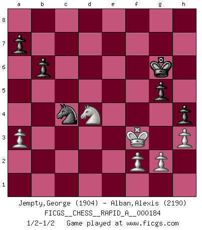 Last move : 1/2-1/2 2015 November 8 13:26:23 [Event "FICGS__CHESS__RAPID_A__000184"] [Site "FICGS"] [Date "2015.10.08"] [Round "1"] [White "Jempty,George"] [Black "Alban,Alexis"] [Result "1/2-1/2"] [WhiteElo "1904"] [BlackElo "2190"] 1.e4 c6 2.c4 d5 3.exd5 cxd5 4.d4 Nf6 5.Nc3 Nc6 6.Bg5 dxc4 7.Bxc4 h6 8.Bh4 e6 9.d5 exd5 10.Bxd5 Be6 11.Bxe6 Qxd1+ 12.Rxd1 fxe6 13.Nge2 Rd8 14.Rxd8+ Nxd8 15.a3 Nc6 16.O-O g5 17.Bg3 Kf7 18.Rd1 Be7 19.Nc1 h5 20.h3 h4 21.Bd6 Bxd6 22.Rxd6 Ke7 23.Rd1 e5 24.Nb3 b6 25.Kf1 Ke6 26.Ke2 Rf8 27.Rc1 Rd8 28.Ne4 Nxe4 29.Rxc6+ Kf5 30.Rc7 Nf6 31.Rf7 Kg6 32.Re7 Nd5 33.Rxe5 Nf4+ 34.Kf3 Nd3 35.Re4 Nxb2 36.Rd4 Rxd4 37.Nxd4 Nc4 1/2-1/2 George Jempty I need a new line with better winning chances against the CK but the Advance is too theoretical Caro-Kann : Anti-anti-Caro-Kann defense Kingside Castling by player White (move 16) This chess game ended in a draw. Follow this game move after move (download)It is not enough to be a good player... you must also play well. (Siegbert Tarrasch) Schach ist gnadenlos. Du mußt bereit sein zu töten. (Nigel Short) Un Peón pasado aumenta su poder a medida de que el número de piezas en el tablero disminuye. (Capablanca) Il vaut toujours mieux jouer un plan faux de façon logique que de n'avoir pas de plan du tout. (Victor Kortchnoï) The hypothalamus is one of the most important parts of the brain, involved in many kinds of motivation, among other functions. The hypothalamus controls the 'Four Fs: Fighting, Fleeing, Feeding and Mating. (Unknown author)