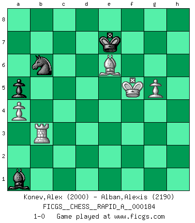 Last move : 1-0 2016 February 4 17:51:41 [Event "FICGS__CHESS__RAPID_A__000184"] [Site "FICGS"] [Date "2015.10.08"] [Round "1"] [White "Konev,Alex"] [Black "Alban,Alexis"] [Result "1-0"] [WhiteElo "2000"] [BlackElo "2190"] 1.e4 c6 2.d4 d5 3.e5 c5 4.c3 Nc6 5.Be2 Bf5 6.Nf3 e6 7.O-O cxd4 8.Nxd4 Nge7 9.Nxf5 Nxf5 10.Bd3 g6 11.Qe2 Bg7 12.f4 O-O 13.Kh1 Qd7 14.g4 Nfe7 15.Nd2 f6 16.exf6 Rxf6 17.Nf3 Raf8 18.Qg2 Qd6 19.Re1 h6 20.Qh3 Rxf4 21.Bxf4 Rxf4 22.Rad1 e5 23.g5 h5 24.Nd2 Nd8 25.Nc4 Qc7 26.Ne3 Nf7 27.Rf1 e4 28.Rxf4 Qxf4 29.Bc2 Nxg5 30.Qg3 Qxg3 31.hxg3 Be5 32.Kg2 Kg7 33.Bb3 d4 34.cxd4 Bb8 35.Bd5 b5 36.Bb7 a5 37.b3 Ba7 38.a4 bxa4 39.bxa4 Kf6 40.Nc4 Nf5 41.d5 e3 42.d6 e2 43.Re1 Nd4 44.d7 Ke7 45.Ne5 Bc5 46.Nc6+ Kxd7 47.Nxd4 Bxd4 48.Rxe2 Kd6 49.Re8 Ne6 50.Rg8 g5 51.Bc8 Ng7 52.Rd8+ Ke5 53.Rd7 Nf5 54.Rh7 Nd6 55.Bd7 Bc3 56.Rxh5 Bd2 57.Kf3 Kd4 58.Rh8 Kc4 59.Ke2 Bb4 60.Rh5 Kd4 61.Rxg5 Ne4 62.Rg4 Ke5 63.Bc6 Nc5 64.Ke3 Ba3 65.Rh4 Bc1+ 66.Kf3 Bg5 67.Rh5 Kf5 68.g4+ Kf6 69.Rh8 Bd2 70.Rd8 Bb4 71.Rd6+ Ke7 72.Rd5 Kf7 73.Bb5 Ke6 74.Bc4 Ke7 75.g5 Nd7 76.Kf4 Bc3 77.Kf5 Nb6 78.Rd3 Bb2 79.Be6 Ba1 80.Rb3 1-0 Caro-Kann : Advance variation Kingside Castling by player White (move 7) Kingside Castling by player Black (move 12) 10 pieces endgame at move 56 : White KRBPP , Black KBNPP WHITE : King + 1 Rook 1 Bishop 2 Pawns BLACK : King + 1 Bishop 1 Knight 2 Pawns 9 pieces endgame at move 61 : White KRBPP , Black KBNP WHITE : King + 1 Rook 1 Bishop 2 Pawns BLACK : King + 1 Bishop 1 Knight 1 Pawn Player White won this chess game. Follow this game move after move (download)If your opponent offers you a draw, try to work out why he thinks he's worse off. (Nigel Short) Das Zentrum ist der Balkan des Schachbretts - Kriegshandlungen können in jedem Moment ausbrechen. (Aaron Nimzowitsch) Las combinaciones han sido siempre el aspecto más intrigante del Ajedrez. Los Maestros las buscan, el público las aplauden, los críticos las alaban. La razón se debe a que las combinaciones hacen posible que el Ajedrez sea más que un ejercicio matemático con una carencia de vida. Ellas son la poesía del juego, son del Ajedrez lo que la melodía es de la música. Ellas representan el triunfo de la mente sobre la materia. (Reuben Fine) Nous sommes les pions de la mystérieuse partie d'Echecs jouée par Dieu. Il nous déplace, nous arrête, nous pousse encore, puis nous lance un à un dans la boîte du Néant. Epitaphe sur la tombe de David Janowsky (1868-1927). Methinks King Thibault should dub Marius Zubac a knight of the square board... I mean table, henceforth addressing him as Sir Marius, and bestow on him a suitable land from the kingdom of FICGS & marry him off to a worthy, fair maiden, lest he slice our heads with his mighty sword in his wrath. (Dinesh De Silva)