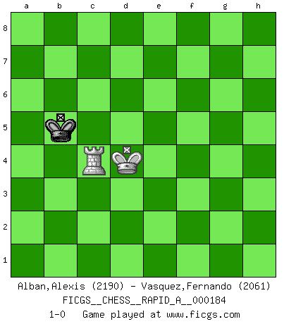 Last move : 1-0 2016 January 9 16:24:4 [Event "FICGS__CHESS__RAPID_A__000184"] [Site "FICGS"] [Date "2015.10.08"] [Round "1"] [White "Alban,Alexis"] [Black "Vasquez,Fernando"] [Result "1-0"] [WhiteElo "2190"] [BlackElo "2061"] 1.e4 e5 2.Nf3 Nf6 3.d4 Nxe4 4.Nxe5 d5 5.Nd2 Bd6 6.Nxe4 dxe4 7.Nc4 O-O 8.c3 Be6 9.d5 Bf5 10.Be2 Na6 11.b4 Qf6 12.Bd2 Nb8 13.O-O Nd7 14.f4 Nb6 15.Nxd6 Qxd6 16.c4 c6 17.g4 Qg6 18.Kh1 Bd7 19.f5 Qf6 20.d6 Qxd6 21.a4 c5 22.b5 Bc8 23.Bf4 Qxd1 24.Rfxd1 h5 25.a5 Nd7 26.h3 hxg4 27.hxg4 Re8 28.Kg2 g6 29.Rd5 f6 30.Rd6 Kg7 31.Rh1 a6 32.Bh6+ Kg8 33.Bd2 e3 34.Bc3 gxf5 35.gxf5 Kg7 36.Kf3 b6 37.Kf4 axb5 38.axb6 Rb8 39.Rg1+ Kf8 40.Bxf6 Nxf6 41.Rxf6+ Ke7 42.Rh6 Kd8 43.Rd1+ Bd7 44.Rhd6 Rb7 45.f6 Kc8 46.Ra1 Kb8 47.Bf3 Be6 48.Bxb7 Kxb7 49.Ra7+ Kb8 50.Re7 Rxe7 51.fxe7 Bf7 52.Rd8+ Kb7 53.cxb5 Kxb6 54.e8Q Bxe8 55.Rxe8 e2 56.Rxe2 Kxb5 57.Ke5 Kb4 58.Rc2 c4 59.Kd4 Kb5 60.Rxc4 1-0 Petrov : Modern attack, Symmetrical variation Kingside Castling by player Black (move 7) Kingside Castling by player White (move 13) 10 pieces endgame at move 51 : White KRPPP , Black KBPPP WHITE : King + 1 Rook 3 Pawns BLACK : King + 1 Bishop 3 Pawns 9 pieces endgame at move 53 : White KRPPP , Black KBPP WHITE : King + 1 Rook 3 Pawns BLACK : King + 1 Bishop 2 Pawns 8 pieces endgame at move 53 : White KRPP , Black KBPP WHITE : King + 1 Rook 2 Pawns BLACK : King + 1 Bishop 2 Pawns Promotion Queen by player White (move 54) 7 pieces endgame at move 54 : White KRP , Black KBPP WHITE : King + 1 Rook 1 Pawn BLACK : King + 1 Bishop 2 Pawns 6 pieces endgame at move 55 : White KRP , Black KPP WHITE : King + 1 Rook 1 Pawn BLACK : King + 2 Pawns 5 pieces endgame at move 56 : White KRP , Black KP WHITE : King + 1 Rook 1 Pawn BLACK : King + 1 Pawn 4 pieces endgame at move 56 : White KR , Black KP WHITE : King + 1 Rook BLACK : King + 1 Pawn 3 pieces endgame at move 60 : White KR , Black K WHITE : King + 1 Rook BLACK : King + Player White won this chess game. Follow this game move after move (download)By this measure (on the gap between Fischer & his contemporaries), I consider him the greatest world champion. (Garry Kasparov) Mein Name ist Rustam Kamsky. Sie haben meinen Sohn belästigt. Bereiten Sie sich aufs Sterben vor. (Rustam Kamsky) Nunca antes ha habido un jugador de Ajedrez con tal conocimiento a fondo de las complejidades del juego y una inmensa voluntad absolutamente indomable de ganar. Yo pienso que Fischer es el jugador mas grande que jamás haya existido. (Lisa Lane) Je crois qu'il existe des manières très spécifiques de jouer efficacement contre une machine. Evidemment, nous n'avons aucune chance en technique pure, parce que l'ordinateur calcule de manière parfaite. Mais lorsque nous faisons appel à notre cerveau, en utilisant l'intuition et la compréhension, alors nous restons beaucoup plus forts. (Anatoli Karpov) The best teachers teach from the heart, not from the book. (Author unknown)