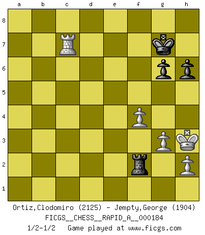Last move : 1/2-1/2 2016 February 3 23:5:52 [Event "FICGS__CHESS__RAPID_A__000184"] [Site "FICGS"] [Date "2015.10.08"] [Round "1"] [White "Ortiz,Clodomiro"] [Black "Jempty,George"] [Result "1/2-1/2"] [WhiteElo "2125"] [BlackElo "1904"] 1.d4 d5 2.c4 Nc6 3.Nc3 dxc4 4.d5 Ne5 5.f4 Nd7 6.e4 Nb6 7.Bxc4 c6 8.Bb3 e6 9.Qe2 Bb4 10.dxe6 Bxe6 11.Bxe6 fxe6 12.Nf3 Nf6 13.O-O O-O 14.Bd2 Qe8 15.g3 Rd8 16.e5 Bc5+ 17.Kh1 Nfd5 18.Ne4 Be7 19.Neg5 Nc7 20.Ne4 Nbd5 21.b4 Qh5 22.Rab1 Rd7 23.Rb3 h6 24.a3 Rfd8 25.Be1 Ra8 26.Qc4 R7d8 27.Qe2 Rd7 28.Bd2 Rad8 29.Rc1 Kh8 30.a4 Qf5 31.Be1 Qf8 32.b5 c5 33.Rcb1 Nb4 34.Nxc5 Bxc5 35.Bxb4 Bxb4 36.Rxb4 Nd5 37.Nh4 Kg8 38.Rc4 Qa3 39.Re1 Nc3 40.Qc2 Nd1 41.Rc8 Qf8 42.Rxd8 Qxd8 43.Qa2 Rd2 44.Qxe6+ Kh7 45.b6 axb6 46.Nf3 Rb2 47.Qf5+ Kg8 48.Kg1 Qd5 49.Qe4 Qc5+ 50.Qd4 Qc2 51.Qd5+ Kh8 52.Qd2 Qxd2 53.Nxd2 Rxd2 54.e6 Rd8 55.e7 Re8 56.Rxd1 Rxe7 57.Rd6 Re4 58.Rxb6 Rxa4 59.Kg2 Ra2+ 60.Kh3 Rf2 61.Rxb7 g6 62.Re7 Kg8 63.Re5 Kf7 64.Rd5 Kg7 65.Ra5 Kf6 66.Ra6+ Kg7 67.Ra7+ Kg8 68.Ra5 Kg7 69.Rc5 Kf6 70.Rc8 Kg7 71.Rc7+ 1/2-1/2 George Jempty I feel lucky to have drawn after the bad middlegame position I got from the opening. Indeed, the New in Chess yearbook which came out in December 2015 has an article entitled "Is 3...dxc4 in the Chigorin Defence refuted?" and I think it is. In any case I think you needed to play 32.Nc5 to keep your advantage by limiting my activity. Clodomiro Ortiz you are right,anyway, i have secured victory in this tournament with a clear winning position against fernando vasquez .. Scott Nichols Vasquez did that to me also; gets losing position, quits playing. To ashamed to resign, but they don't realize this is worse shame. George Jempty According to Stockfish7 I am up 10.5 against Vasquez in a Q v. R+N ending, I guess if I don't get my rating points in March, I will get them in May QGD : Chigorin defense Kingside Castling by player White (move 13) Kingside Castling by player Black (move 13) 10 pieces endgame at move 58 : White KRPPP , Black KRPPP WHITE : King + 1 Rook 3 Pawns BLACK : King + 1 Rook 3 Pawns 9 pieces endgame at move 61 : White KRPPP , Black KRPP WHITE : King + 1 Rook 3 Pawns BLACK : King + 1 Rook 2 Pawns This chess game ended in a draw. Follow this game move after move (download)The only thing Chess players have in common is Chess. (Lodewijk Prins) Ivan Sokolov treibt mich als Beifahrer an mit go Loeky go - . (Loek van Wely) Ciertamente, de todas la drogas del mundo, el Ajedrez debe ser el mas placentero permamentemente. (Assiac) Soyez une menace à chaque fois que vous vous asseyez pour jouer. (Ken Smith) Life is like a game of cards: the hand you are dealt represents determinism; the way you play it is free will. (Jawaharlal Nehru)