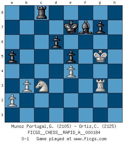 Last move : 0-1 2016 January 26 12:37:43 [Event "FICGS__CHESS__RAPID_A__000184"] [Site "FICGS"] [Date "2015.10.08"] [Round "1"] [White "Munoz Portugal,Guillermo"] [Black "Ortiz,Clodomiro"] [Result "0-1"] [WhiteElo "2105"] [BlackElo "2125"] 1.e4 e5 2.Nf3 Nc6 3.Bb5 Nf6 4.d3 d6 5.Nc3 a6 6.Bxc6 bxc6 7.d4 Nd7 8.O-O a5 9.Na4 f6 10.Qe2 Qe7 11.c4 Qf7 12.Be3 Be7 13.Qc2 O-O 14.c5 Ba6 15.Rfd1 Rad8 16.dxe5 fxe5 17.cxd6 cxd6 18.Ng5 Qg6 19.Qxc6 Be2 20.Rd2 Bg4 21.h3 Bh5 22.Qc4 Kh8 23.Qe6 Qe8 24.g4 Bg6 25.h4 Nf6 26.Nc3 h6 27.h5 Nxh5 28.gxh5 Bxh5 29.Kh2 Rf6 30.Qh3 hxg5 31.Bxg5 Rg6 32.f4 Bxg5 33.fxg5 Rxg5 34.Rg1 Rg6 35.Rxg6 Qxg6 36.Rf2 Qh6 37.b3 Kh7 38.Kg3 Re8 39.Qf5 Bg6 40.Qg4 Qe3+ 41.Qf3 Qe1 42.Kg2 Qc1 43.Qd3 Qg5+ 44.Qg3 Kh6 45.Rf3 Rc8 46.Qxg5 Kxg5 47.Rg3 Kf6 48.Nd5 Kf7 49.Nc3 Bh5 50.Kh3 Kf8 51.Kh4 Bf7 52.Nb5 Rc6 53.Nc3 Ke7 54.Kg5 Rc8 0-1 This chess game has been lost on time (started : 2015.10.08 0:24:58) Ruy Lopez : Berlin defense Kingside Castling by player White (move 8) Kingside Castling by player Black (move 13) Player Black won this chess game. Follow this game move after move (download)The way he plays Chess demonstrates a man's whole nature. (Stanley Ellin) Man braucht nicht immer den besten Zug zu spielen: Ein Zug muß aktiv, unternehmungslustig, korrekt und schön sein. (David Bronstein) ¿Esta Bobby Fischer algo cuerdo?. (Salo Flohr) Comme les marins qui ont mille raisons différentes d'aller en mer, les joueurs d'échecs en ont tout autant avant de s'installer devant une table et jouer... (Vincent Bertignac, philosophe) Don't be discouraged. It's often the last key in the bunch that opens the lock. (Author unknown)