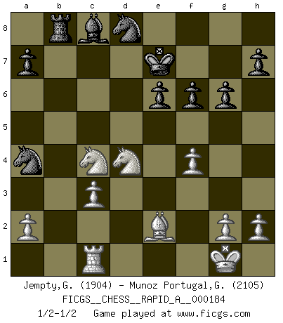 Last move : 1/2-1/2 2016 January 18 2:11:34 [Event "FICGS__CHESS__RAPID_A__000184"] [Site "FICGS"] [Date "2015.10.08"] [Round "1"] [White "Jempty,George"] [Black "Munoz Portugal,Guillermo"] [Result "1/2-1/2"] [WhiteElo "1904"] [BlackElo "2105"] 1.e4 c5 2.c3 Nf6 3.e5 Nd5 4.d4 cxd4 5.Nf3 d6 6.Bc4 dxe5 7.Nxe5 e6 8.Qxd4 Qb6 9.Qxb6 Nxb6 10.Be2 Bd6 11.Nf3 Nc6 12.O-O O-O 13.Rd1 Be7 14.Bf4 f6 15.Bd6 Bxd6 16.Rxd6 Kf7 17.Na3 Ke7 18.R6d1 Rd8 19.Nd2 Na4 20.Ndc4 Rb8 21.Rxd8 Nxd8 22.Rc1 b5 23.Ne3 Nxb2 24.Nxb5 Nc6 25.f4 Na4 26.Nd4 Nd8 27.Nc4 g6 1/2-1/2 George Jempty I think I became a little too eager to exchange pieces beginning with 15.Bd6 but then on move 22 I went with Stockfish6's top choice at depth 42, even though it wasn't among Komodo9.3's top four choices (also at depth 42) Sicilian : Alapin's variation (2.c3) Kingside Castling by player White (move 12) Kingside Castling by player Black (move 12) This chess game ended in a draw. Follow this game move after move (download)I like the moment when I break a man's ego. (Bobby Fischer) Ich würde mich als ganz normalen Jungen bezeichnen [Im Alter von 12]. (Sergej Karjakin) Cuando tengas duda... ¡juega al Ajedrez!. (Tevis) J'apprécie les joueurs d'est-indienne, c'est grâce à eux que je nourris ma famille depuis tant d'années. (Petrosian) Men never do evil so completely and cheerfully as when they do it from religious conviction. (Blaise Pascal)
