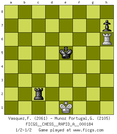 Last move : 1/2-1/2 2016 February 8 5:13:29 [Event "FICGS__CHESS__RAPID_A__000184"] [Site "FICGS"] [Date "2015.10.08"] [Round "1"] [White "Vasquez,Fernando"] [Black "Munoz Portugal,Guillermo"] [Result "1/2-1/2"] [WhiteElo "2061"] [BlackElo "2105"] 1.e4 c5 2.c3 Nf6 3.e5 Nd5 4.d4 cxd4 5.cxd4 d6 6.Nf3 dxe5 7.dxe5 Nc6 8.Bc4 Ndb4 9.Qb3 e6 10.O-O Na5 11.Qc3 Bd7 12.a3 Nxc4 13.axb4 Rc8 14.Qd4 Qb6 15.Qxb6 Nxb6 16.Rxa7 Bxb4 17.Bd2 Bxd2 18.Nfxd2 Bc6 19.Nc3 Ke7 20.Nb3 Ra8 21.Rfa1 Rxa7 22.Rxa7 Nc4 23.Nc5 Rd8 24.f4 Kf8 25.Nxb7 Rd2 26.Ra8+ Ke7 27.Ra7 Rxg2 28.Kf1 Ke8 29.Ra8+ Kd7 30.Ra7 Ne3 31.Ke1 Bxb7 32.Rxb7+ Kc6 33.Rxf7 Rxb2 34.Rxg7 Rxh2 35.Ra7 Nd5 36.Nxd5 Kxd5 37.Ra6 Rc2 38.Rd6+ Ke4 39.Rxe6 Kxf4 40.Rh6 Kxe5 1/2-1/2 Sicilian : Alapin's variation (2.c3) Kingside Castling by player White (move 10) 10 pieces endgame at move 34 : White KRNPP , Black KRNPP WHITE : King + 1 Rook 1 Knight 2 Pawns BLACK : King + 1 Rook 1 Knight 2 Pawns 9 pieces endgame at move 36 : White KRNPP , Black KRPP WHITE : King + 1 Rook 1 Knight 2 Pawns BLACK : King + 1 Rook 2 Pawns 8 pieces endgame at move 36 : White KRPP , Black KRPP WHITE : King + 1 Rook 2 Pawns BLACK : King + 1 Rook 2 Pawns 7 pieces endgame at move 39 : White KRPP , Black KRP WHITE : King + 1 Rook 2 Pawns BLACK : King + 1 Rook 1 Pawn 6 pieces endgame at move 39 : White KRP , Black KRP WHITE : King + 1 Rook 1 Pawn BLACK : King + 1 Rook 1 Pawn 5 pieces endgame at move 40 : White KR , Black KRP WHITE : King + 1 Rook BLACK : King + 1 Rook 1 Pawn This chess game ended in a draw. Follow this game move after move (download)It's just you and your opponent at the board and you're trying to prove something. (Bobby Fischer) Ich spiele ehrlich und spiele, um zu gewinnen. Wenn ich verliere nehme ich meine Medizin. (Robert James Fischer) El juego de Fischer siempre fue nítido, racional y brillante. Uno de los mejores por siempre. (Dave Regis) Le moment que je préfère le plus dans une rencontre, c'est celui où je sens que la personnalité de l'adversaire se brise. (Robert Fischer) Just because you do not take an interest in politics doesn't mean politics won't take an interest in you. (Pericles 430 B.C.)