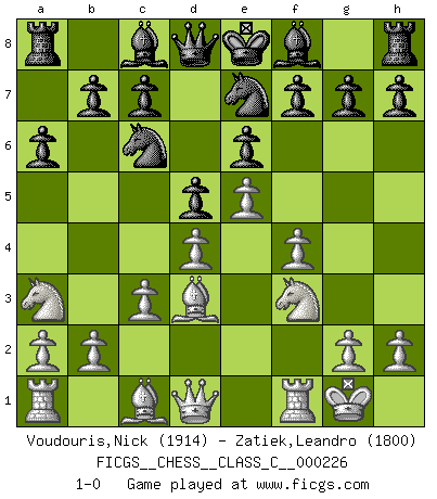 Last move : 1-0 2015 November 28 19:47:51 [Event "FICGS__CHESS__CLASS_C__000226"] [Site "FICGS"] [Date "2015.10.14"] [Round "1"] [White "Voudouris,Nick"] [Black "Zatiek,Leandro"] [Result "1-0"] [WhiteElo "1914"] [BlackElo "1800"] 1.d4 Nf6 2.f4 e6 3.e3 Nc6 4.c3 Ne4 5.Nf3 a6 6.Bd3 Nf6 7.e4 d5 8.e5 Ng8 9.O-O Nge7 10.Na3 1-0 This chess game has been lost on time (started : 2015.10.14 21:43:12) Canard Opening Kingside Castling by player White (move 9) Player White won this chess game. Follow this game move after move (download)Up to this point White has been following well-known analysis. But now he makes a fatal error: he begins to use his own head. (Siegbert Tarrasch) Es gibt Leute, die glauben, alles wäre vernünftig, was man mit einem ernsthaften Gesicht tut. (Georg Christoph Lichtenberg) El Ajedrez es un regaderazo frío para la mente. (Sir John Simon) Les Cavaliers se révèlent fort utiles dans les positions fermées. D'habitude, les Fous sont un peu plus forts que les Cavaliers dans les positions ouvertes. Qu'on le veuille ou non, il restera toujours des exceptions ! Are you threatening me, Master Jedi ? (Chancellor Palpatine in Star Wars ep.3)