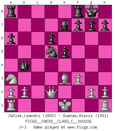 Last move : 0-1 2015 October 17 0:29:25 [Event "FICGS__CHESS__CLASS_C__000226"] [Site "FICGS"] [Date "2015.10.14"] [Round "1"] [White "Zatiek,Leandro"] [Black "Duenas,Alexis"] [Result "0-1"] [WhiteElo "1800"] [BlackElo "1901"] 1.e4 c5 2.Nf3 Nc6 3.d4 cxd4 4.Nxd4 e5 5.Nb5 d6 6.Be3 Nf6 7.f3 Be7 8.Bc4 O-O 9.N1c3 a6 10.Na3 b5 11.Bd5 Bb7 12.Bxc6 Bxc6 13.Nd5 Bxd5 14.exd5 Qa5+ 15.c3 b4 16.cxb4 Qxb4+ 17.Qd2 Nxd5 0-1 Sicilian : Labourdonnais-Loewenthal (Kalashnikov) variation Kingside Castling by player Black (move 8) Player Black won this chess game. Follow this game move after move (download)When you play Bobby, it is not a question if you win or lose. It is a question if you survive. (Boris Spassky) Der Freibauer hat für mich eine Seele, genau wie der Mensch, Wünsche, die unerkannt in ihm schlummern, und Befürchtungen, von deren Existenz er selbst kaum ahnt. (Aaron Nimzowitsch) El Ajedrez es parte de la cultura, y si una cultura esta en decadencia, entonces también el Ajedrez declinará. (Mikhail Botvinnik) Il (Jacob Murray) ne joue pas pour le bon coup, mais pour le meilleur. (Eloi Relange) To be champion requires more than simply being a strong player; one has to be a strong human being as well. (Anatoly Karpov)