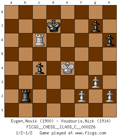 Last move : 1/2-1/2 2016 June 26 7:13:55 [Event "FICGS__CHESS__CLASS_C__000226"] [Site "FICGS"] [Date "2015.10.14"] [Round "1"] [White "Evgen,Novik"] [Black "Voudouris,Nick"] [Result "1/2-1/2"] [WhiteElo "1900"] [BlackElo "1914"] 1.c4 f5 2.Nc3 Nf6 3.Nf3 e6 4.g3 d5 5.cxd5 exd5 6.Bg2 c6 7.O-O Bd6 8.d3 Bc7 9.Rb1 a5 10.Re1 O-O 11.e4 fxe4 12.dxe4 dxe4 13.Qb3+ Kh8 14.Ng5 a4 15.Nxa4 h6 16.Nxe4 Nxe4 17.Rxe4 Bf5 18.Be3 Nd7 19.Rd1 Bxe4 20.Bxe4 Qe7 21.Bc2 b6 22.Nxb6 Bxb6 23.Bxb6 Nxb6 24.Qxb6 Qf6 25.a4 Rae8 26.Rf1 Re2 27.Qc5 Rd8 28.b4 Rd5 29.Qc4 R5d2 30.Bb3 Qf8 31.Qf7 Qxf7 32.Bxf7 Rb2 33.a5 Rxb4 34.a6 Re7 35.Bg6 c5 36.Rd1 Rb8 37.Rc1 Ra7 38.Ra1 c4 39.Be4 Rb4 40.Kg2 Kg8 41.Bb7 Kf7 42.Ra5 Ke6 43.Kf3 R4xb7 44.axb7 Rxb7 45.Rc5 Rb3+ 46.Ke4 Rb2 47.Rc6+ Kd7 1/2-1/2 English : Anglo-Dutch defense Kingside Castling by player White (move 7) Kingside Castling by player Black (move 10) 10 pieces endgame at move 44 : White KRPPP , Black KRPPP WHITE : King + 1 Rook 3 Pawns BLACK : King + 1 Rook 3 Pawns This chess game ended in a draw. Follow this game move after move (download)If I win a tournament, I win it by myself. I do the playing. Nobody helps me. (Bobby Fischer) Alle offensichtlichen Züge sehen nach dem Spiel in der Analyse verdächtig aus. (Viktor Kortschnoi) Vive, pierde y aprende al observar a tu oponente como ganar. (Amber Steenbock) Il vaut mieux sacrifier les pièces de l'adversaire. (Xavier Tartacover) Always remember that you are unique; just like everyone else. (Unknown)