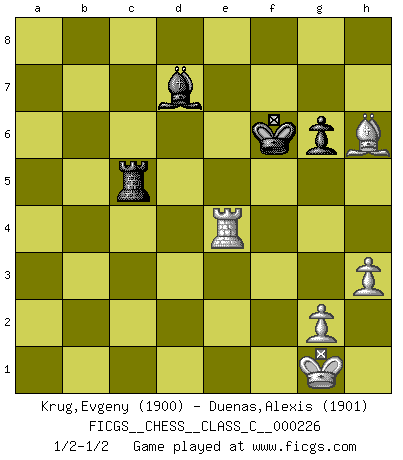Last move : 1/2-1/2 2016 May 29 14:13:44 [Event "FICGS__CHESS__CLASS_C__000226"] [Site "FICGS"] [Date "2015.10.14"] [Round "1"] [White "Krug,Evgeny"] [Black "Duenas,Alexis"] [Result "1/2-1/2"] [WhiteElo "1900"] [BlackElo "1901"] 1.c4 e5 2.Nc3 Nc6 3.Nf3 f5 4.e3 Nf6 5.Be2 e4 6.Nd4 Nxd4 7.exd4 Be7 8.O-O O-O 9.d3 c6 10.dxe4 fxe4 11.Bg5 d5 12.cxd5 cxd5 13.Qb3 Be6 14.Qxb7 Rb8 15.Qxa7 Ra8 16.Qb7 Rb8 17.Qa6 Rb6 18.Qa5 Bb4 19.Qa4 Bd6 20.h3 h6 21.Be3 Bb8 22.f4 exf3 23.Rxf3 Rxb2 24.Qa3 Rb7 25.Bd3 Bd6 26.Qa4 Bf7 27.Rb1 Rxb1+ 28.Bxb1 Re8 29.Bf5 Qb8 30.Qb5 Qc7 31.Qd3 Qc6 32.Qc2 Qc4 33.Bd3 Qb4 34.a3 Qxa3 35.Nb5 Qa6 36.Nxd6 Qxd6 37.Bf4 Qb6 38.Qc5 Qxc5 39.dxc5 Rc8 40.Be3 Ne4 41.Rf1 Be6 42.Rc1 Bd7 43.Be2 Kf7 44.Bf3 Ke7 45.Re1 g6 46.Bxh6 Rxc5 47.Bxe4 dxe4 48.Rxe4+ Kf6 1/2-1/2 English : Three knights system Kingside Castling by player White (move 8) Kingside Castling by player Black (move 8) 10 pieces endgame at move 47 : White KRBPP , Black KRBPP WHITE : King + 1 Rook 1 Bishop 2 Pawns BLACK : King + 1 Rook 1 Bishop 2 Pawns 9 pieces endgame at move 48 : White KRBPP , Black KRBP WHITE : King + 1 Rook 1 Bishop 2 Pawns BLACK : King + 1 Rook 1 Bishop 1 Pawn This chess game ended in a draw. Follow this game move after move (download)I'd rather have a Pawn than a finger. (Reuben Fine) Die Elozahlen sind sehr schlecht für das Schach. Jetzt ist Schach eine Sportindustrie, die darauf zielt Elopunkte zu machen. (Miguel Najdorf) Bendita sea la memoria de aquel que dio al mundo este juego inmortal. (A. G. Gardiner) L'attaque fait le spectacle, la défense gagne les matchs. (Dicton footballistique) Luck is the residue of design. (John Milton)