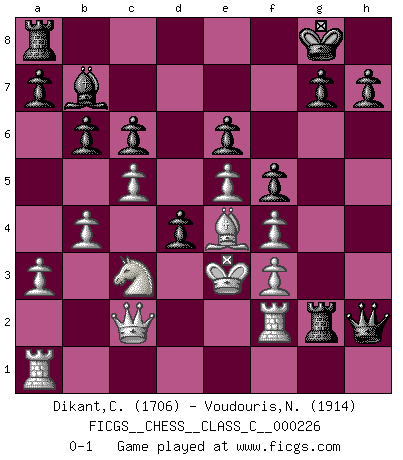 Last move : 0-1 2015 December 20 16:34:28 [Event "FICGS__CHESS__CLASS_C__000226"] [Site "FICGS"] [Date "2015.10.14"] [Round "1"] [White "Dikant,Christophe"] [Black "Voudouris,Nick"] [Result "0-1"] [WhiteElo "1706"] [BlackElo "1914"] 1.d4 d5 2.Bf4 e6 3.Nf3 Bd6 4.e3 f5 5.c4 c6 6.Nc3 Nf6 7.Bd3 O-O 8.O-O Ne4 9.Qc2 b6 10.a3 Bb7 11.b4 Bxf4 12.exf4 Nd7 13.c5 Rf6 14.Ne5 Rh6 15.Bxe4 Nxe5 16.dxe5 Qh4 17.f3 Qxh2+ 18.Kf2 Rg6 19.Ke3 Rxg2 20.Rf2 d4+ 0-1 Queen's pawn, Mason variation Kingside Castling by player Black (move 7) Kingside Castling by player White (move 8) Player Black won this chess game. Follow this game move after move (download)Everything is in a state of flux, and this includes the world of Chess. (Mikhail Botvinnik) Die starken Figuren des Gegners muss man abtauschen. (José Raúl Capablanca) El Ajedrez, como la música, como el amor, tiene el poder de hacer feliz a la gente. (Siegbert Tarrasch) Les pièces de l'échiquier étaient impitoyables. Elles le retenaient, elles l'absorbaient. Il y avait de l'horreur en cela, mais aussi une harmonie unique. Car, qu'y a-t-il dans le monde, à part les échecs ? (V. Nabokov) Over-the-board chess is the favorite of mortals, correspondence chess is the favorite of the gods. (Eduard Dyckhoff)