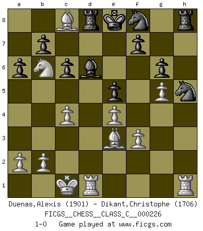 Last move : 1-0 2015 December 10 21:6:45 [Event "FICGS__CHESS__CLASS_C__000226"] [Site "FICGS"] [Date "2015.10.14"] [Round "1"] [White "Duenas,Alexis"] [Black "Dikant,Christophe"] [Result "1-0"] [WhiteElo "1901"] [BlackElo "1706"] 1.d4 d6 2.e4 Nf6 3.Nc3 e5 4.dxe5 dxe5 5.Qxd8+ Kxd8 6.Nf3 Bd6 7.Be3 Be6 8.Ng5 Ke7 9.f3 Nbd7 10.Nxe6 Kxe6 11.O-O-O a6 12.g4 h6 13.h4 Rad8 14.g5 hxg5 15.hxg5 Nh5 16.Bh3+ Ke7 17.Nd5+ Ke8 18.Bg4 g6 19.c4 c6 20.Nb6 Nf8 21.Bc8 1-0 Queen's Pawn Queenside Castling by player White (move 11) Player White won this chess game. Follow this game move after move (download)The tactician knows what to do when there is something to do; whereas the strategian knows what to do when there is nothing to do. (Gerald Abrahams) Schach verlangt totale Konzentration. (Robert James Fischer) Siempre es mejor sacrificar los hombres de tu oponente. (Savielly Tartakower) Le thème de l'attaque double intervient d'une manière ou d'une autre dans l'immense majorité des combinaisons. (Youri Averbakh) The hypothalamus is one of the most important parts of the brain, involved in many kinds of motivation, among other functions. The hypothalamus controls the 'Four Fs: Fighting, Fleeing, Feeding and Mating. (Unknown author)