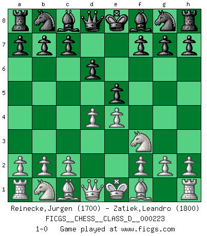 Last move : 1-0 2015 November 30 19:54:7 [Event "FICGS__CHESS__CLASS_D__000223"] [Site "FICGS"] [Date "2015.10.15"] [Round "1"] [White "Reinecke,Jurgen"] [Black "Zatiek,Leandro"] [Result "1-0"] [WhiteElo "1700"] [BlackElo "1800"] 1.e4 e5 2.Nf3 d6 3.d4 1-0 This chess game has been lost on time (started : 2015.10.15 1:47:6) Philidor's defense Player White won this chess game. Follow this game move after move (download)Chess is thirty to forty percent psychology. You don't have this when you play a computer. I can't confuse it. (Judith Polgar) Das Schachspiel ist ein See, in welchem eine Mücke baden und ein Elefant ertrinken kann. (Emanuel Lasker) El ganar no lo es todo... pero el perder es nada. (Mednis) Pour moi, les échecs ne sont pas un jeu mais un art. (Alexandre Alekhine) Tomorrow's what you make of it. (Horatio Caine, C.S.I. Miami)