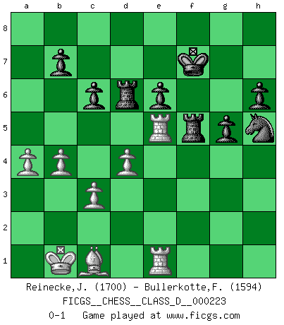 Last move : 0-1 2016 February 27 16:37:50 [Event "FICGS__CHESS__CLASS_D__000223"] [Site "FICGS"] [Date "2015.10.15"] [Round "1"] [White "Reinecke,Jurgen"] [Black "Bullerkotte,Frank"] [Result "0-1"] [WhiteElo "1700"] [BlackElo "1594"] 1.e4 c6 2.d4 d5 3.Nc3 dxe4 4.Nxe4 Bf5 5.Ng3 Bg6 6.h4 h6 7.Nf3 Nd7 8.h5 Bh7 9.Bd3 Bxd3 10.Qxd3 e6 11.Bd2 a5 12.O-O-O Bb4 13.c3 Be7 14.Kb1 Ngf6 15.Ne4 Nxe4 16.Qxe4 Nf6 17.Qe2 Qd5 18.Ne5 Qe4+ 19.Qxe4 Nxe4 20.Be3 a4 21.f3 Ng3 22.Rh3 Nf5 23.Bf2 Bd6 24.g4 Ne7 25.f4 a3 26.Nc4 Bxf4 27.Nxa3 Nd5 28.Nc4 O-O 29.Ne3 Bxe3 30.Bxe3 f5 31.gxf5 Rxf5 32.Bc1 Nf6 33.Rdh1 R8a5 34.b4 Rad5 35.Re3 Kf7 36.Rhe1 Rd6 37.Re5 Nxh5 38.a4 g5 0-1 Caro-Kann : Classical, 7...Nd7 Queenside Castling by player White (move 12) Kingside Castling by player Black (move 28) Player Black won this chess game. Follow this game move after move (download)You may learn much more from a game you lose than from a game you win. You will have to lose hundreds of games before becoming a good player. (Jose Raul Capablanca) In der Schule lernt man nichts. Es ist nur Zeitverschwendung. (Robert James Fischer) Los libros de Ajedrez deben de usarse igual como usamos los anteojos: para mejorar la vista, aunque algunos jugadores los quieren usar como si ellos les otorgaran la vision. (José Raúl Capablanca) On n'a jamais que l'âge auquel on a commence à jouer aux échecs car après on cesse de vieillir. (Capablanca) In my experience, there's no such thing as luck. (Obi-Wan Kenobi in Star Wars ep.4)