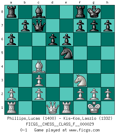 Last move : 0-1 2007 June 6 12:27:42 [Event "FICGS__CHESS__CLASS_F__000029"] [Site "FICGS"] [Date "2007.03.13"] [Round "1"] [White "Phillips,Lucas"] [Black "Kis-Kos,Laszlo"] [Result "0-1"] [WhiteElo "1400"] [BlackElo "1332"] 1.e4 c5 2.Nf3 d6 3.d4 cxd4 4.Nxd4 Nf6 5.Nc3 a6 6.Bc4 e6 7.Bg5 Be7 8.O-O O-O 9.Bxf6 Bxf6 10.Nf3 Bxc3 11.bxc3 Nc6 12.Re1 Qc7 13.e5 Nxe5 0-1 Sicilian : Najdorf, Lipnitzky attack Kingside Castling by player White (move 8) Kingside Castling by player Black (move 8) Player Black won this chess game. Follow this game move after move (download)The Pin is mightier than the sword. (Fred Reinfeld) Später, ... hatte ich zunehmend Erfolg in entscheidenden Partien. Vielleicht weil ich eine einfache Wahrheit erkannte: nicht nur ich hatte Angst, auch mein Gegner. (Mikhail Nekhemyevich Tal) Sin errores no puede haber brillantez. (Emanuel Lasker) Avant la finale, les dieux ont créé le milieu de partie. (Tarrasch) Train yourself to let go of everything you fear to lose. (Master Yoda in Star Wars ep.3)