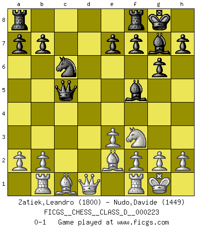 Last move : 0-1 2015 December 20 21:23:6 [Event "FICGS__CHESS__CLASS_D__000223"] [Site "FICGS"] [Date "2015.10.15"] [Round "1"] [White "Zatiek,Leandro"] [Black "Nudo,Davide"] [Result "0-1"] [WhiteElo "1800"] [BlackElo "1449"] 1.d4 Nf6 2.c4 g6 3.Nc3 d5 4.e3 Bg7 5.cxd5 Nxd5 6.Nf3 O-O 7.Be2 c5 8.O-O Nc6 9.Nxd5 Qxd5 10.dxc5 Qxc5 11.Rb1 Bf5 0-1 King's Indian defense, 3.Nc3 Kingside Castling by player Black (move 6) Kingside Castling by player White (move 8) Player Black won this chess game. Follow this game move after move (download)I thought the most common mistake [in chess] was the first one: Learning the game :P (Garvin Gray, FICGS forum) Ich habe die Schachforschung dermaßen betrieben, dass sie auf eine wissenschaftliche Basis gestellt wurde. (Mikhail Moiseyevich Botvinik) El Ajedrez no es una pizca de inferior al violín, y tenemos un gran número de violinistas profesionales. (Mikhail Botvinnik) J'ai vu le vaincu d'Echecs jouer des années durant dans l'espoir de la fête de la victoire. Car tu es plus riche de ce qu'elle existe si même elle n'est point pour toi. Ainsi de la perle du fond des mers. (Antoine de Saint-Exupéry) The real danger is not that computers will begin to think like men, but that men will begin to think like computers. (Sydney J. Harris)