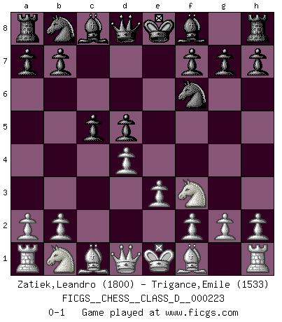 Last move : 0-1 2015 December 7 8:19:1 [Event "FICGS__CHESS__CLASS_D__000223"] [Site "FICGS"] [Date "2015.10.15"] [Round "1"] [White "Zatiek,Leandro"] [Black "Trigance,Emile"] [Result "0-1"] [WhiteElo "1800"] [BlackElo "1533"] 1.d4 Nf6 2.c4 c5 3.Nf3 e6 4.e3 d5 5.cxd5 exd5 0-1 This chess game has been lost on time (started : 2015.10.15 1:47:6) Benoni defense Player Black won this chess game. Follow this game move after move (download)The only thing Chess players have in common is Chess. (Lodewijk Prins) Frage: Gibt es etwas was Sie mehr lieben als Autobahnen ohne Tempobegrenzungen? - Antwort: Deutsche Frauen ohne Tempobegrenzungen. (Loek van Wely) El muchacho (en ese entonces un niño de 12 años llamado Anatoly Karpov) no tiene ni idea de lo que es el Ajedrez y no hay futuro en absoluto para el en esta profesión. (Mikhail Botvinnik) Soyez une menace à chaque fois que vous vous asseyez pour jouer. (Ken Smith) See no evil, hear no evil, speak no evil. (The 3 monkeys)