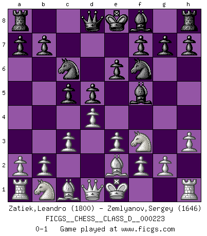 Last move : 0-1 2015 December 4 7:57:37 [Event "FICGS__CHESS__CLASS_D__000223"] [Site "FICGS"] [Date "2015.10.15"] [Round "1"] [White "Zatiek,Leandro"] [Black "Zemlyanov,Sergey"] [Result "0-1"] [WhiteElo "1800"] [BlackElo "1646"] 1.d4 Nf6 2.Nf3 d5 3.e3 c5 4.Be2 Nc6 5.h3 Bf5 6.c3 e6 0-1 This chess game has been lost on time (started : 2015.10.15 1:47:6) Queen's pawn game Player Black won this chess game. Follow this game move after move (download)The stomach is an essential part of the Chess master. (Bent Larsen) Drei Punkte vor allen anderen ist wie einer, der im weißen Anzug posiert, während der Rest in Müllsäcke gekleidet dasteht. (Viktor Kortschnoi) ¿Se han dado cuenta de que Fischer casi nunca ha tenido piezas malas? El las intercambia y las piezas malas se quedan con sus oponenets. (Yuri Balashov) Demandez au pauvre Cg1 ce qu'il en pense. Eduard Gufeld à propos de la variante Saemisch de l'Est-Indienne. The greatest con, that he ever pulled... was making you believe... that he is you. (Revolver, movie)