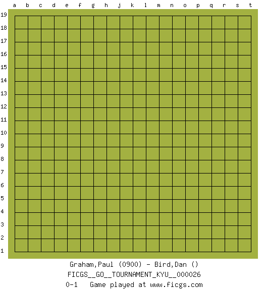 Last move : 0-1 2007 April 13 10:53:59 [Event "FICGS__GO__TOURNAMENT_KYU__000026"] [Site "FICGS"] [Date "2007.03.14"] [Round "1"] [Black "Graham,Paul"] [White "Bird,Dan"] [Result "0-1"] [Rating 1 "0900"] 0-1 This go game has been lost on time (started : 2007.03.14 5:49:3) Here are the names of the openings (joseki) played in the four corners : Player White won this Go (weiqi, baduk) game. Follow this game move after move (download)Don't count territory held by only one eye. (Anonymous) Two beer, or not two beer. (Unknown)