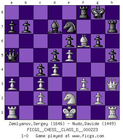 Last move : 1-0 2015 November 21 18:29:43 [Event "FICGS__CHESS__CLASS_D__000223"] [Site "FICGS"] [Date "2015.10.15"] [Round "1"] [White "Zemlyanov,Sergey"] [Black "Nudo,Davide"] [Result "1-0"] [WhiteElo "1646"] [BlackElo "1449"] 1.e4 e6 2.d4 d5 3.Nc3 Bb4 4.e5 c5 5.a3 Bxc3+ 6.bxc3 Ne7 7.Qg4 O-O 8.Bd3 c4 9.Bh6 Ng6 10.Bxg6 fxg6 11.Be3 Nc6 12.h4 Rf5 13.Ne2 Bd7 14.Ng3 Qa5 15.Bd2 Rf7 16.h5 Ne7 17.f3 gxh5 18.Qxh5 g6 19.Qg4 Rg7 20.Ne2 h5 21.Qh3 Rh7 22.Bg5 Rf8 23.Bf6 1-0 French : Winawer, Advance, poisoned pawn variation Kingside Castling by player Black (move 7) Player White won this chess game. Follow this game move after move (download)Many Chess players were surprised when after the game, Fischer quietly explained: 'I had already analyzed this possibility' in a position which I thought was not possible to foresee from the opening. (Mikhail Tal) Intelligenz läßt sich nicht am Weg, sondern nur am Ergebnis feststellen. (Garry Kasparov) ¡Examina movidas que hagan daño! Un buen ojo for movidas desvastantes es mucho mas importante que el conocimiento de principios estratégicos. (Purdy) La tactique est l'élément le plus important du milieu de jeu. (Siegbert Tarrasch) The intuitive mind is a sacred gift; the rational mind is a faithful servant. We have created a society that honors the servant but has forgotten the gift. (Albert Einstein)