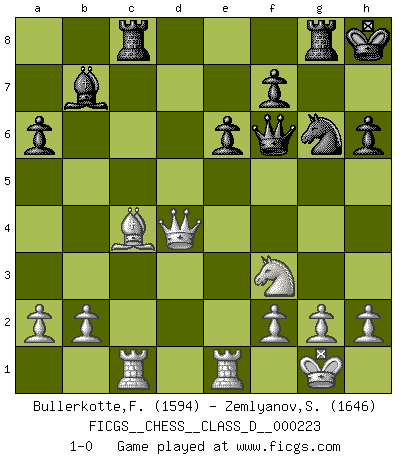 Last move : 1-0 2016 April 11 9:22:16 [Event "FICGS__CHESS__CLASS_D__000223"] [Site "FICGS"] [Date "2015.10.15"] [Round "1"] [White "Bullerkotte,Frank"] [Black "Zemlyanov,Sergey"] [Result "1-0"] [WhiteElo "1594"] [BlackElo "1646"] 1.d4 d5 2.c4 c6 3.Nf3 Nf6 4.Nc3 e6 5.Bg5 h6 6.Bh4 dxc4 7.e4 g5 8.Bg3 b5 9.Be2 Bb7 10.O-O Nbd7 11.d5 cxd5 12.exd5 Nxd5 13.Nxb5 a6 14.Nbd4 Bg7 15.Bxc4 O-O 16.Re1 Rc8 17.Rc1 g4 18.Ne5 Nxe5 19.Bxe5 Bxe5 20.Rxe5 Qf6 21.Re4 Nf4 22.Qxg4+ Ng6 23.R4e1 Kh8 24.Nf3 Rg8 25.Qd4 1-0 This chess game has been lost on time (started : 2015.10.15 1:47:6) QGD Slav : 4.Nc3 Kingside Castling by player White (move 10) Kingside Castling by player Black (move 15) Player White won this chess game. Follow this game move after move (download)Any material change in a position must come about by mate, a capture, or a Pawn promotion. (Purdy) Alle offensichtlichen Züge sehen nach dem Spiel in der Analyse verdächtig aus. (Viktor Kortschnoi) Vive, pierde y aprende al observar a tu oponente como ganar. (Amber Steenbock) Les échecs c'est le défi de l'alpiniste, toujours plus haut, prêt à tout pour monter à l'assaut du Roi ennemi. Les échecs, c'est de la musique en mouvement, un ballet majestueux pour les yeux. C'est de la poésie composée par les fantômes du passé qui au même titre que Rimbaud ou Verlaine méritent notre admiration. Les échecs, c'est de la peinture ou le moindre mouvement modifie le tableau pour en faire un Picasso ou un Van Gogh. Les échecs, c'est tout et rien, c'est la vie et la mort. Jjulie33 sur le forum de France-Echecs. But they are useless. They can only give you answers. (Pablo Picasso, about computers)