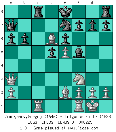 Last move : 1-0 2016 January 20 13:36:45 [Event "FICGS__CHESS__CLASS_D__000223"] [Site "FICGS"] [Date "2015.10.15"] [Round "1"] [White "Zemlyanov,Sergey"] [Black "Trigance,Emile"] [Result "1-0"] [WhiteElo "1646"] [BlackElo "1533"] 1.e4 c6 2.d4 d5 3.e5 Bf5 4.Nf3 e6 5.Be2 c5 6.Be3 Qb6 7.Nc3 a6 8.Na4 Qa5+ 9.c3 Nd7 10.dxc5 Nxc5 11.Nxc5 Bxc5 12.b4 Bxb4 13.cxb4 Qxb4+ 14.Bd2 Qb6 15.Qa4+ Kf8 16.Qa3+ Ke8 17.Ba5 Qa7 18.Rc1 b6 19.Bb4 Ne7 20.Bd6 Rc8 21.O-O 1-0 Caro-Kann : Advance variation Kingside Castling by player White (move 21) Player White won this chess game. Follow this game move after move (download)One bad move nullifies forty good ones. (Horowitz) Wer der Ansicht ist, daß alle Schachspieler verrückt sind, wird durch Studium des Lebens von Emil Josef Diemer nicht auf andere Gedanken kommen. (Hans Ree) El Ajedrez es parte de una cultura y si una cultura esta en decadencia, entonces también el Ajedrez declinará. (Mikhail Botvinnik) La tactique, c'est ce que vous faites quand il y a quelque chose à faire; la stratégie, c'est ce que vous faites quand il n'y a rien à faire. (Savielli Tartacower) Life is painting a picture, not doing a sum. (Oliver Wendell Holmes, Jr.)