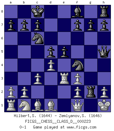 Last move : 0-1 2015 November 23 20:5:37 [Event "FICGS__CHESS__CLASS_D__000223"] [Site "FICGS"] [Date "2015.10.15"] [Round "1"] [White "Hilbert,Stephan J."] [Black "Zemlyanov,Sergey"] [Result "0-1"] [WhiteElo "1644"] [BlackElo "1646"] 1.e4 e5 2.Nf3 Nc6 3.Bc4 Nf6 4.c3 Nxe4 5.O-O d5 6.Bb3 Nc5 7.Re1 Nd3 8.Re2 Bg4 9.Bc2 Bxf3 10.gxf3 Qg5+ 11.Kh1 Nf4 12.Qf1 Qh5 13.Re3 O-O-O 14.Bd1 Rd6 15.d4 Rh6 16.Qg1 Rg6 17.Qf1 Rg2 0-1 Two knights defense Kingside Castling by player White (move 5) Queenside Castling by player Black (move 13) Player Black won this chess game. Follow this game move after move (download)You must take your opponent into a deep dark forest where 2+2=5, and the path leading out is only wide enough for one. (Mikhail Tal) Schach ist das Spiel, das die Verrückten gesund hält. (Albert Einstein) Las Aperturas te enseñan aperturas. ¡Los Finales te enseñan Ajedrez!. (Stephan Gerzadowicz) Les échecs sont un jeu par leur forme, un art par leur essence et une science par sa difficulté d'acquisition. Ils peuvent vous procurer autant de plaisir qu'un bon livre ou une belle musique, mais vous n'aurez une réelle joie que si vous arrivez à bien jouer. (Tigran Petrosian) Wisdom is the reward you get for a lifetime of listening when you'd have preferred to talk. (Doug Larson)