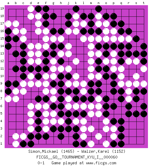 Last move : 0-1 2015 November 11 21:34:24 [Event "FICGS__GO__TOURNAMENT_KYU_I__000060"] [Site "FICGS"] [Date "2015.10.16"] [Round "1"] [Black "Simon,Mickael"] [White "Walzer,Karel"] [Result "0-1"] [Rating 1 "1465"] [Rating 2 "1152"] 1.r16 d3 2.q3 c16 3.p17 d5 4.r5 e17 5.k3 q11 6.c10 c8 7.c13 k16 8.r13 r12 9.q13 r7 10.k5 h4 11.m16 l17 12.m17 k10 13.j17 j16 14.f17 e16 15.h16 j14 16.g14 k12 17.f18 e18 18.k8 o4 19.p6 m5 20.h6 g5 21.m8 m3 22.h2 n7 23.p8 q9 24.n8 p3 25.q4 f10 26.h10 p2 27.n11 h15 28.g16 g15 29.l18 f15 30.o7 l2 31.h8 d10 32.d11 d9 33.q2 n2 34.e19 d19 35.f19 d18 36.f2 f3 37.g3 f4 38.j3 b14 39.f12 g11 40.b13 m13 41.e11 f8 42.c1 c2 43.d1 b2 44.n14 m14 45.s13 s12 46.b9 b8 47.b11 o12 48.f7 g7 49.g6 f6 50.e7 g8 51.g9 f9 52.h7 n10 53.o10 m10 54.o11 m11 55.n12 s6 56.s5 k17 57.j18 k18 58.k19 n13 59.o13 n15 60.o14 m15 61.t12 t11 62.t13 s10 63.a8 a7 64.a9 b7 65.b15 b16 66.c14 c15 67.a14 e13 68.f13 e14 69.t6 t7 70.t5 p12 71.p1 o1 72.q1 o16 73.m18 o17 74.o18 p16 75.q17 q15 76.q14 r15 77.s15 s14 78.r14 n18 79.p18 n17 80.n19 m6 81.q16 p15 82.q12 p11 83.p9 q10 84.s8 r8 85.s7 s9 86.r6 t9 87.t8 k6 88.j5 l6 89.a16 a17 90.a15 b17 91.h12 h11 92.m7 n6 93.e2 b1 94.d2 e12 95.f11 d12 96.c12 g10 97.h9 g12 98.e3 d4 99.e4 f5 100.e5 e6 101.g13 h13 102.k2 f16 103.g18 l4 104.o5 n5 105.p4 o3 106.q7 l9 107.k7 d14 108.j10 j11 109.h14 j13 110.q8 r9 111.o6 k9 112.h5 g4 113.h3 d6 114.l16 l15 115.l1 m1 116.k1 l3 117.e10 e9 118.n9 m12 119.p10 j6 120.t14 p13 121.p14 l8 122.l7 j7 123.j8 f14 124.c11 pass 125.pass k4 126.j4 o15 127.n16 d13 128.m9 c9 129.l5 j9 0-1 Here are the names of the openings (joseki) played in the four corners : Player White won this Go (weiqi, baduk) game. Follow this game move after move (download)Six eyes in a rectangle are alive. (Anonymous) If you work for a living, why do you kill yourself working ? (Tuco to a chicken in The Good, The Bad and The Ugly)