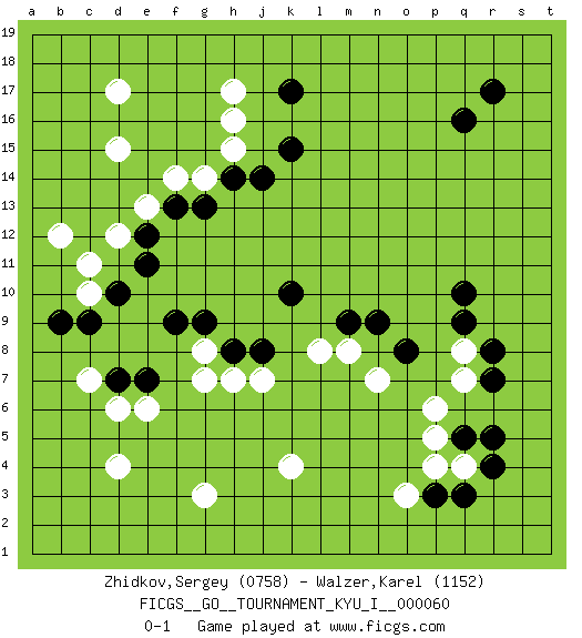 Last move : 0-1 2015 December 28 22:15:28 [Event "FICGS__GO__TOURNAMENT_KYU_I__000060"] [Site "FICGS"] [Date "2015.10.16"] [Round "1"] [Black "Zhidkov,Sergey"] [White "Walzer,Karel"] [Result "0-1"] [Rating 1 "0758"] [Rating 2 "1152"] 1.q16 d4 2.r4 d17 3.p3 d15 4.k17 c11 5.q10 k4 6.k10 c7 7.r17 h17 8.k15 q7 9.r8 q8 10.r7 q4 11.q3 p4 12.q5 p5 13.r5 p6 14.e11 d12 15.e12 o3 16.e7 g3 17.d10 c10 18.c9 l8 19.m9 m8 20.n9 g7 21.b9 b12 22.f9 e13 23.f13 f14 24.g13 g14 25.h14 h15 26.j14 h16 27.j8 j7 28.h8 h7 29.o8 n7 30.q9 g8 31.g9 e6 32.d7 d6 0-1 This go game has been lost on time (started : 2015.10.16 15:41:0) Here are the names of the openings (joseki) played in the four corners : Player White won this Go (weiqi, baduk) game. Follow this game move after move (download)Everything would seem to be possible in Go. Like pulling a rabbit, by a magical move, out of a hat. (Pierre Audouard) If I had no sense of humor, I would long ago have committed suicide. (Mahatma Gandhi)