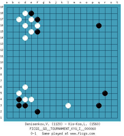 Last move : 0-1 2015 November 29 19:52:7 [Event "FICGS__GO__TOURNAMENT_KYU_I__000060"] [Site "FICGS"] [Date "2015.10.16"] [Round "1"] [Black "Denisenkov,Valentin"] [White "Kis-Kos,Laszlo"] [Result "0-1"] [Rating 1 "1120"] [Rating 2 "1560"] 1.q16 d4 2.q3 d16 3.r5 l3 4.f17 d14 5.d17 c17 6.e16 d18 7.e18 e15 8.f15 e17 9.c3 f16 10.d3 e4 11.c4 d6 12.f2 c5 0-1 This go game has been lost on time (started : 2015.10.16 15:41:0) Here are the names of the openings (joseki) played in the four corners : Corner d16 : d16 f17 Hoshi (Hwajeom, Seongjeom, Xingwei`) 4-4 Point. The star or hoshi (4-4) point, emphasizing influence at the potential expense of territory. Ikken Kakari (Hankan Keolch'im, Yi Gua`jiao~, 1-Space Low Approach). Black 2 is the standard approach move to the 4-4. Corner d4 : d4 c3 Hoshi (Hwajeom, Seongjeom, Xingwei`) 4-4 Point. The star or hoshi (4-4) point, emphasizing influence at the potential expense of territory. Player White won this Go (weiqi, baduk) game. Follow this game move after move (download)If you cannot succeed, then die gloriously. (Chinese proverb) I don't know, I don't care, and it doesn't make any difference. (Albert Einstein)