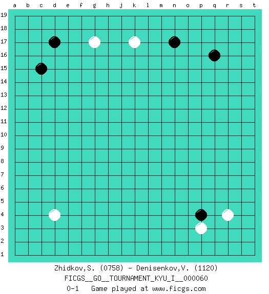 Last move : 0-1 2015 December 16 8:59:29 [Event "FICGS__GO__TOURNAMENT_KYU_I__000060"] [Site "FICGS"] [Date "2015.10.16"] [Round "1"] [Black "Zhidkov,Sergey"] [White "Denisenkov,Valentin"] [Result "0-1"] [Rating 1 "0758"] [Rating 2 "1120"] 1.q16 r4 2.d17 d4 3.c15 k17 4.n17 g17 5.p4 p3 0-1 This go game has been lost on time (started : 2015.10.16 15:41:0) Here are the names of the openings (joseki) played in the four corners : Corner q4 : r4 p4 Komoku (Somok, Xiao~mu`) 3-4 Point. The komoku (3-4) point is the traditional corner enclosure move.. Ikken Takagakari (Hankan Nop'dakeolch'im, Yi Gaogua`jiao~, 1-Space High Approach). The 5-4 approach move has become more popular in modern times, as modern Go emphasizes speed and influence. Player White won this Go (weiqi, baduk) game. Follow this game move after move (download)The simplest move is the best move. (Anonymous) Programmer - an organism that turns coffee into software. (Anonymous)