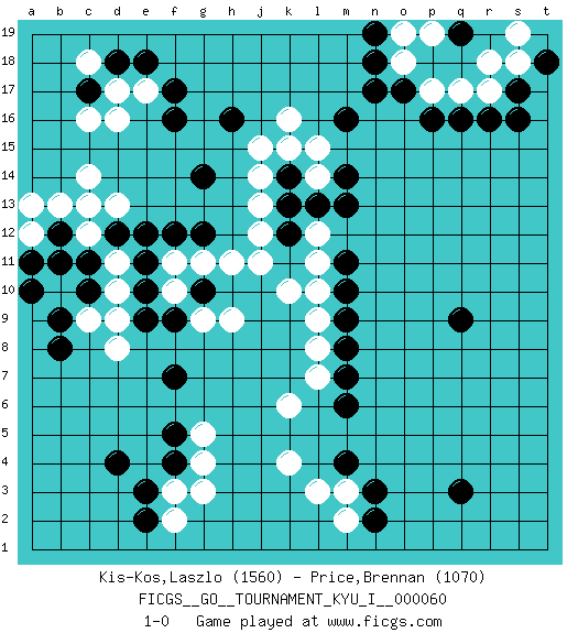Last move : 1-0 2016 March 2 13:12:36 [Event "FICGS__GO__TOURNAMENT_KYU_I__000060"] [Site "FICGS"] [Date "2015.10.16"] [Round "1"] [Black "Kis-Kos,Laszlo"] [White "Price,Brennan"] [Result "1-0"] [Rating 1 "1560"] [Rating 2 "1070"] 1.r16 d10 2.q3 d16 3.d4 p17 4.m16 r18 5.p16 q17 6.q16 k4 7.q9 k16 8.o17 o18 9.n17 k10 10.m4 k6 11.m6 l8 12.f16 e17 13.f17 c14 14.h16 j15 15.g14 j13 16.g12 j11 17.k12 j12 18.g10 h9 19.d12 c12 20.c11 d11 21.c10 d13 22.e12 c9 23.b12 c13 24.b9 d8 25.b8 b13 26.b11 l12 27.s17 s18 28.n18 p19 29.e9 d9 30.f7 a12 31.a10 a13 32.a11 g3 33.c17 c16 34.e18 d17 35.d18 c18 36.k14 j14 37.k13 l15 38.m14 l14 39.l13 l11 40.m13 k15 41.m10 l10 42.m9 l9 43.m11 g9 44.f9 f10 45.e10 f11 46.e11 g11 47.f12 h11 48.f4 f3 49.e3 g4 50.f5 g5 51.m8 l7 52.m7 m3 53.n3 l3 54.n2 m2 55.e2 f2 56.t18 r17 57.s16 s19 58.n19 o19 59.q19 1-0 Here are the names of the openings (joseki) played in the four corners : Corner q16 : r16 p17 Komoku (Somok, Xiao~mu`) 3-4 Point. The komoku (3-4) point is the traditional corner enclosure move.. Ikken Kakari (Hankan Keolch'im, Yi Gua`jiao~, 1-Space Low Pincer). The small knight move is the basic approach move to the 3-4 point stone. It has been continually used for over four centuries. There are limitless variations, with new moves constantly being discovered. White 2 opens the door to a treaure store of joseki. Corner d16 : d16 f16 Hoshi (Hwajeom, Seongjeom, Xingwei`) 4-4 Point. The star or hoshi (4-4) point, emphasizing influence at the potential expense of territory. Ikken Takagakari (Hankan Nop'dakeolch'im, Yi Gaojia, 1-Space High Approach). White typically responds at 6-4 or 3-10. White 4-10 is played when White finds play on the right side advantageous. White 4-8 or 3-8 may be played when White has support at top. Corner d4 : d4 h9 Hoshi (Hwajeom, Seongjeom, Xingwei`) 4-4 Point. The star or hoshi (4-4) point, emphasizing influence at the potential expense of territory. Player Black won this Go (weiqi, baduk) game. Follow this game move after move (download)The intersection is rarely neutral. (Pierre Audouard) Computers make it easier to do a lot of things, but most of the things they make it easier to do don't need to be done. (Andy Rooney)