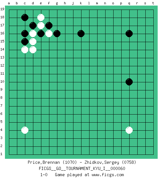 Last move : 1-0 2016 January 8 23:3:57 [Event "FICGS__GO__TOURNAMENT_KYU_I__000060"] [Site "FICGS"] [Date "2015.10.16"] [Round "1"] [Black "Price,Brennan"] [White "Zhidkov,Sergey"] [Result "1-0"] [Rating 1 "1070"] [Rating 2 "0758"] 1.q16 q4 2.d17 c4 3.k16 d15 4.c15 c14 5.c16 d14 6.q10 e17 7.e16 d16 8.f17 e18 9.c18 f16 10.g16 1-0 This go game has been lost on time (started : 2015.10.16 15:41:0) Here are the names of the openings (joseki) played in the four corners : Corner d16 : d17 d15 Komoku (Somok, Xiao~mu`) 3-4 Point. The komoku (3-4) point is the traditional corner enclosure move.. Ikken Takagakari (Hankan Nop'dakeolch'im, Yi Gaogua`jiao~, 1-Space High Approach). The 5-4 approach move has become more popular in modern times, as modern Go emphasizes speed and influence. Player Black won this Go (weiqi, baduk) game. Follow this game move after move (download)The comb formation is alive. (Anonymous) If passion drives you, let reason holds the reins. (Benjamin Franklin)