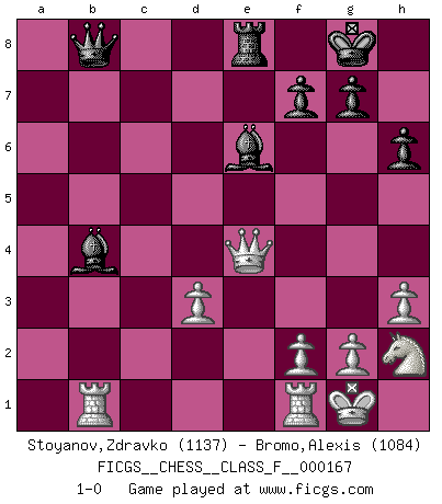 Last move : 1-0 2015 November 8 19:26:59 [Event "FICGS__CHESS__CLASS_F__000167"] [Site "FICGS"] [Date "2015.10.17"] [Round "1"] [White "Stoyanov,Zdravko"] [Black "Bromo,Alexis"] [Result "1-0"] [WhiteElo "1137"] [BlackElo "1084"] 1.e4 e5 2.Nf3 Nc6 3.h3 a6 4.d3 h6 5.Be2 Nf6 6.O-O Bc5 7.a3 d6 8.b4 Bb6 9.c4 O-O 10.Bb2 Re8 11.Nh2 Be6 12.Nd2 Nd4 13.Ndf3 Nxe2+ 14.Qxe2 c5 15.bxc5 Bxc5 16.Rab1 Rb8 17.Qd2 b5 18.cxb5 axb5 19.Qe2 b4 20.axb4 Bxb4 21.Nd2 d5 22.Bxe5 dxe4 23.Bxb8 Qxb8 24.Nxe4 Nxe4 25.Qxe4 1-0 King's pawn game Kingside Castling by player White (move 6) Kingside Castling by player Black (move 9) Player White won this chess game. Follow this game move after move (download)Chess is so inspiring that I do not believe a good player is capable of having an evil thought during the game. (Wilhelm Steinitz) Der zweitbeste Zug ist oft der einzig richtige. (Savielly Grigorievitsch Tartakower) El Ajedrez te enseña a controlarl la excitación inicial que sientes cuando vez algo que parece bueno y te enseña a pensar objetivamente cuando te encuentras en problemas. (Stanley Kubrick) Si rien de grave n'est détecté lors de l'analyse d'une position, on joue alors le coup. Seconde règle de Blumenfeld. Is not life a hundred times too short to bore ourselves ? (Friedrich Nietzsche)