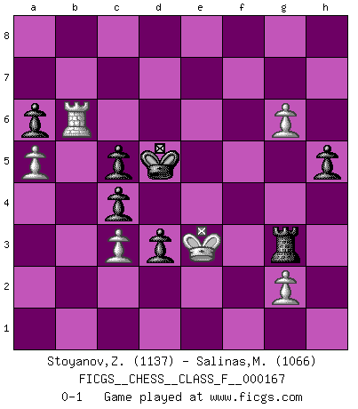 Last move : 0-1 2016 August 17 8:6:50 [Event "FICGS__CHESS__CLASS_F__000167"] [Site "FICGS"] [Date "2015.10.17"] [Round "1"] [White "Stoyanov,Zdravko"] [Black "Salinas,Marcelo"] [Result "0-1"] [WhiteElo "1137"] [BlackElo "1066"] 1.e4 e5 2.Nf3 Nc6 3.Bb5 Qf6 4.d3 Nd4 5.Nxd4 exd4 6.Nd2 Bb4 7.O-O a6 8.Bc4 c6 9.a3 Bxd2 10.Bxd2 b5 11.Ba2 Qg6 12.Qf3 d6 13.c3 Bg4 14.Qg3 Be2 15.Rfe1 Qxg3 16.hxg3 Bxd3 17.cxd4 Bc4 18.Bxc4 bxc4 19.Rec1 d5 20.e5 f6 21.exf6 Nxf6 22.Re1+ Kd7 23.Re5 Rab8 24.Bb4 Rhe8 25.Rae1 Ne4 26.f3 Rxe5 27.dxe5 c5 28.Bc3 Nxc3 29.bxc3 Ke6 30.f4 Rb3 31.a4 d4 32.Rc1 d3 33.Kf2 Rb2+ 34.Ke3 Kd5 35.a5 Re2+ 36.Kf3 h5 37.Rb1 g5 38.fxg5 Rxe5 39.g6 Rf5+ 40.Ke3 Rg5 41.Rb6 Rxg3+ 0-1 Ruy Lopez (Spanish Opening) Kingside Castling by player White (move 7) Player Black won this chess game. Follow this game move after move (download)Chess is everything: art, science and sport. (Anatoly Karpov) Wer sich die Fähigkeit anerziehen will im Schach selbstständig zu denken, der muß alles meiden, was leblos ist: ausgeklügelte Theorien, die sich auf sehr wenige Beispiele und eine Menge Hirngespinste stützen. (Emanuel Lasker) Cuando no sepas que mover, espera por una idea que se le venga a la la cabeza de tu oponente. Tenlo por seguro de que esa idea estará incorrecta. (Siegbert Tarrasch) Aucun coup ne doit être joué sans but. (Pedro Damiano) A cynic is a man who knows the price of everything but the value of nothing. (Oscar Wilde)