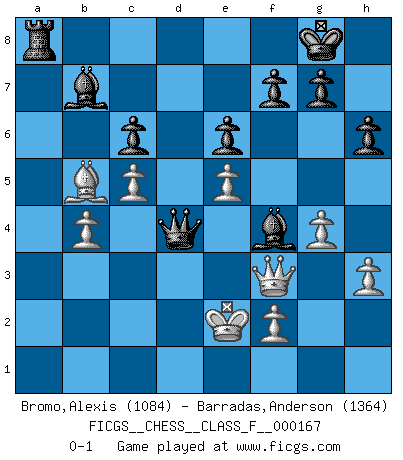 Last move : 0-1 2015 October 23 21:58:13 [Event "FICGS__CHESS__CLASS_F__000167"] [Site "FICGS"] [Date "2015.10.17"] [Round "1"] [White "Bromo,Alexis"] [Black "Barradas,Anderson"] [Result "0-1"] [WhiteElo "1084"] [BlackElo "1364"] 1.d4 d5 2.c4 c6 3.Nc3 Nf6 4.h3 a6 5.Nf3 h6 6.c5 e6 7.Bf4 Nbd7 8.e3 b5 9.b4 a5 10.a3 axb4 11.axb4 Bb7 12.Ne5 Be7 13.Bd3 O-O 14.Ne2 Nh5 15.g4 Nxf4 16.Nxf4 Nxe5 17.dxe5 d4 18.exd4 Bg5 19.Qf3 Rxa1+ 20.Ke2 Rxh1 21.Qxh1 Bxf4 22.Qf3 Qxd4 23.Bxb5 Ra8 0-1 QGD Slav defense Kingside Castling by player Black (move 13) Player Black won this chess game. Follow this game move after move (download)White lost because he failed to remember the right continuation and had to think up the moves himself. (Siegbert Tarrasch) Es genügt nicht ein guter Spieler zu sein, man muß auch gut spielen. (Siegbert Tarrasch) La mitad de las variaciones que son calculadas en una partida de torneo, resultan ser completamente superfluas. Desafortunadamente, nadie sabe por adelantado cual mitad. (Jan Tinman) Echiquier : carré parfait, comme la Jérusalem nouvelle décrite par l'auteur de l'Apocalypse, huit cases sur huit, exaltation du chiffre 4, symbole du cosmos aux quatre horizons... où le noir et le blanc, l'ombre et la lumière, le mal et le bien s'entremêlent et se conjuguent. (Robert Couffignal, Le Gambit du poète) Question: Is 'This statement is paradoxical' a paradoxical statement ? Or is it a meta-paradox ? (Normajean Yates)