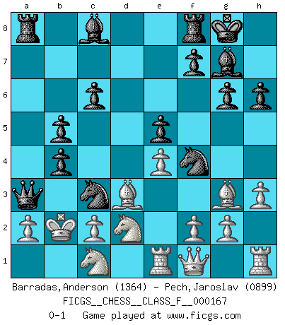 Last move : 0-1 2016 January 16 12:38:33 [Event "FICGS__CHESS__CLASS_F__000167"] [Site "FICGS"] [Date "2015.10.17"] [Round "1"] [White "Barradas,Anderson"] [Black "Pech,Jaroslav"] [Result "0-1"] [WhiteElo "1364"] [BlackElo "0899"] 1.e4 d6 2.d4 Nf6 3.Nc3 g6 4.Be3 Bg7 5.Bd3 e5 6.dxe5 dxe5 7.Bg5 h6 8.Bh4 c6 9.Nf3 Qc7 10.Qe2 O-O 11.h3 Nh5 12.O-O-O Nf4 13.Qf1 Nd7 14.b4 b5 15.Bg3 a5 16.Ne2 axb4 17.Kb1 Qa5 18.Nc1 Nc5 19.Nd2 Na4 20.Re1 Nc3+ 21.Kb2 Qa3+ 0-1 Pirc defense Kingside Castling by player Black (move 10) Queenside Castling by player White (move 12) Player Black won this chess game. Follow this game move after move (download)To avoid losing a piece, many a person has lost the game. (Savielly Tartakover) Je mehr ich von der FIDE weiss, um so weniger verstehe ich. (Alexander Kalifman) El Ajedrez es un mar en el cual un mosquito puede beber y un elefante puede bañarse. (Refrán Hindú) Demandez au pauvre Cg1 ce qu'il en pense. Eduard Gufeld à propos de la variante Saemisch de l'Est-Indienne. Every now and then a man's mind is stretched by a new idea and never shrinks back to its former dimensions. (Oliver Wendell Holmes, Sr.)