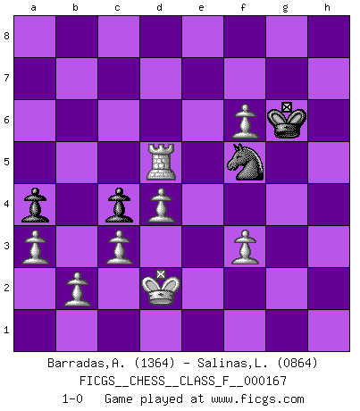 Last move : 1-0 2016 March 30 20:38:8 [Event "FICGS__CHESS__CLASS_F__000167"] [Site "FICGS"] [Date "2015.10.17"] [Round "1"] [White "Barradas,Anderson"] [Black "Salinas,Loreva"] [Result "1-0"] [WhiteElo "1364"] [BlackElo "0864"] 1.e4 a5 2.d4 c6 3.Nf3 b5 4.Bd3 a4 5.a3 e6 6.Nc3 h6 7.Ne5 Qf6 8.Qf3 d6 9.Qxf6 Nxf6 10.Nf3 Be7 11.e5 Nd5 12.Nxd5 exd5 13.Bd2 Bg5 14.Nxg5 hxg5 15.Bxg5 g6 16.h4 Bf5 17.Bxf5 gxf5 18.exd6 Nd7 19.O-O-O f6 20.Rde1+ Kd8 21.Bd2 c5 22.c3 c4 23.f3 Ra6 24.Bf4 Re8 25.h5 Nf8 26.h6 Ng6 27.h7 Nh8 28.Rxe8+ Kxe8 29.Rh6 Kf7 30.g4 Kg7 31.gxf5 Rxd6 32.Kd2 Nf7 33.Rg6+ Kxh7 34.Bxd6 Nxd6 35.Rxf6 Ne8 36.Rb6 Ng7 37.f6 Nf5 38.Rxb5 Kg6 39.Rxd5 1-0 This chess game has been lost on time (started : 2015.10.17 16:11:8) Corn stalk defense Queenside Castling by player White (move 19) Player White won this chess game. Follow this game move after move (download)War is the child of passion, passion is the child of narcissism and narcissism is the child. (...) Another game ? (Thibault de Vassal) Die Elozahlen sind sehr schlecht für das Schach. Jetzt ist Schach eine Sportindustrie, die darauf zielt Elopunkte zu machen. (Miguel Najdorf) No soy una persona materialista y por eso, no resiento la falta o pérdida del dinero. La ausencia de cosas mundanas carece de importancia. Ya que el Ajedrez es una forma en la que puedo ser tan materialista como yo desee sin tener la necesidad de vender mi alma. (Jamie Walter Adams) La guerre est enfant de la passion, la passion est enfant du narcissisme et le narcissisme est l'enfant. (...) Une autre partie ? (Thibault de Vassal) It's not enough to succeed. Others must fail. (Gore Vidal)