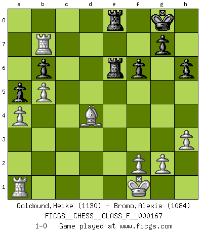 Last move : 1-0 2015 October 29 20:42:0 [Event "FICGS__CHESS__CLASS_F__000167"] [Site "FICGS"] [Date "2015.10.17"] [Round "1"] [White "Goldmund,Heike"] [Black "Bromo,Alexis"] [Result "1-0"] [WhiteElo "1130"] [BlackElo "1084"] 1.b4 e5 2.Bb2 d6 3.e3 a6 4.c4 Nf6 5.d3 h6 6.Nf3 Bg4 7.Be2 c6 8.Qb3 Nbd7 9.Nbd2 Be7 10.O-O O-O 11.a4 Re8 12.h3 Bh5 13.Rfd1 Bxf3 14.Bxf3 d5 15.cxd5 cxd5 16.Bxd5 Nxd5 17.Qxd5 b6 18.b5 a5 19.Nf3 Bf6 20.e4 Rc8 21.d4 exd4 22.Nxd4 Bxd4 23.Qxd4 f6 24.Qxd7 Qxd7 25.Rxd7 Rxe4 26.Rb7 Re6 27.Kf1 Rce8 28.Bd4 1-0 Polish (Sokolsky) opening Kingside Castling by player White (move 10) Kingside Castling by player Black (move 10) Player White won this chess game. Follow this game move after move (download)I look one move ahead... the best ! (Siegbert Tarrasch) Ohne Fehler kann es keine Brillanz geben. (Emanuel Lasker) Jugadores de primera clase pierden en contra de jugadores de segunda clase porque los jugadores de segunda clase a veces juegan una partida de primer clase. (Siegbert Tarrasch) Avant la finale, les dieux ont créé le milieu de partie. (Tarrasch) Real knowledge is to know the extent of one's ignorance. (Confucius)