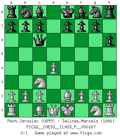 Last move : 0-1 2015 December 20 9:23:31 [Event "FICGS__CHESS__CLASS_F__000167"] [Site "FICGS"] [Date "2015.10.17"] [Round "1"] [White "Pech,Jaroslav"] [Black "Salinas,Marcelo"] [Result "0-1"] [WhiteElo "0899"] [BlackElo "1066"] 1.Nc3 d5 2.d4 h6 3.e4 dxe4 4.Nxe4 Qd5 5.Nc3 Qe6+ 6.Be2 Qc6 0-1 This chess game has been lost on time (started : 2015.10.17 16:11:8) Dunst (Sleipner, Heinrichsen) Opening Player Black won this chess game. Follow this game move after move (download)Chess is war over the board. The object is to crush the opponents mind. (Bobby Fischer) Mein Name ist Rustam Kamsky. Sie haben meinen Sohn belästigt. Bereiten Sie sich aufs Sterben vor. (Rustam Kamsky) Yo considero que Fischer es uno de los expertos mas grandes de aperturas de siempre. (Keith Hayward) À la honte des hommes, on sait que les lois du jeu sont les seules qui soient partout justes, claires, inviolables et exécutées. Pourquoi l'Indien qui a donné les règles du jeu d'échecs est-il obéi de bon gré dans toute la terre, et que les décrétales des papes, par exemple, sont aujourd'hui un objet d'horreur et de mépris ? C'est que l'inventeur des échecs combina tout avec justesse pour la satisfaction des joueurs, et que les papes, dans leurs décrétales, n'eurent en vue que leur seul avantage. L'Indien voulut exercer également l'esprit des hommes et leur donner du plaisir; les papes ont voulu abrutir l'esprit des hommes. Voltaire (Dictionnaire philosophique / Garnier 1967) Tree pose grows confidence. It roots me to this world. (Terri Guillemets)