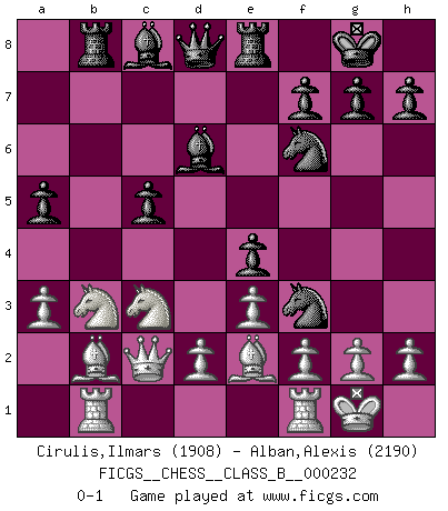 Last move : 0-1 2015 October 28 11:12:51 [Event "FICGS__CHESS__CLASS_B__000232"] [Site "FICGS"] [Date "2015.10.19"] [Round "1"] [White "Cirulis,Ilmars"] [Black "Alban,Alexis"] [Result "0-1"] [WhiteElo "1908"] [BlackElo "2190"] 1.b4 e5 2.a3 d5 3.Bb2 Nd7 4.Nf3 e4 5.Nd4 Ngf6 6.e3 a5 7.b5 Bd6 8.c4 dxc4 9.Bxc4 Ne5 10.Be2 O-O 11.O-O c6 12.bxc6 bxc6 13.Nc3 Re8 14.Qc2 Rb8 15.Rab1 c5 16.Nb3 Nf3+ 0-1 Polish (Sokolsky) opening Kingside Castling by player Black (move 10) Kingside Castling by player White (move 11) Player Black won this chess game. Follow this game move after move (download)Chess is 99 percent tactics. (Teichmann) Das Schach ist nichts für kleine Geister, es beansprucht einen vollen Mann, der sich nicht sklavisch an das Überlieferte hält, sondern selbständig die Tiefen des Spiels zu ergründen sucht. (Wilhelm Steinitz) Me gusta decir que Bobby Fischer fue el mejor jugador que jamás haya existido. Pero lo que hizo de Fischer un genio, fue su habilidad de mezclar una frescura y pragmatismo Americano con ideas Rusas acerca de la estrategia. (Bruce Pandolfini) La vie est comme un jeu d'échecs : nous esquissons un plan, mais celui-ci est tributaire de ce que daignent faire l'adversaire aux échecs et le destin dans la vie. (Arthur Schopenhauer) First of all, we have to go back to the classical time control. (Anatoly Karpov)