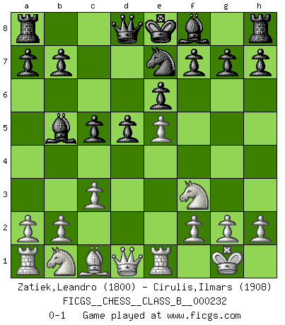 Last move : 0-1 2015 November 29 19:52:7 [Event "FICGS__CHESS__CLASS_B__000232"] [Site "FICGS"] [Date "2015.10.19"] [Round "1"] [White "Zatiek,Leandro"] [Black "Cirulis,Ilmars"] [Result "0-1"] [WhiteElo "1800"] [BlackElo "1908"] 1.e4 c6 2.d4 d5 3.e5 c5 4.Nf3 e6 5.c3 Nc6 6.Bb5 Bd7 7.O-O Nxe5 8.dxe5 Bxb5 9.Re1 Ne7 0-1 This chess game has been lost on time (started : 2015.10.19 12:10:7) Caro-Kann : Advance variation Kingside Castling by player White (move 7) Player Black won this chess game. Follow this game move after move (download)Chess is a fairy tale of 1001 blunders. (Savielly Tartakower) Wenn sie aufgeben, dann danke ich Ihnen für das Spiel (Eventualzug beim Fernschach). (Anonymous) El Ajedrez es tan interesante por sí solo, que no es necesario un interés monetario para persuadir a una persona a que lo practique; por lo tanto, nunca se juega por dinero. (Benjamin Franklin) Mais n'est-ce pas déjà le limiter injurieusement que d'appeler les échecs un jeu? N'est-ce pas aussi une science, un art, ou quelque chose qui, comme le cercueil de Mahomet entre ciel et terre, est suspendu entre l'un et l'autre, et qui réunit un nombre incroyable de contraires ? (Stefan Zweig) If only faces could talk... (Pat Summerall, Sportscaster during the Super Bowl)
