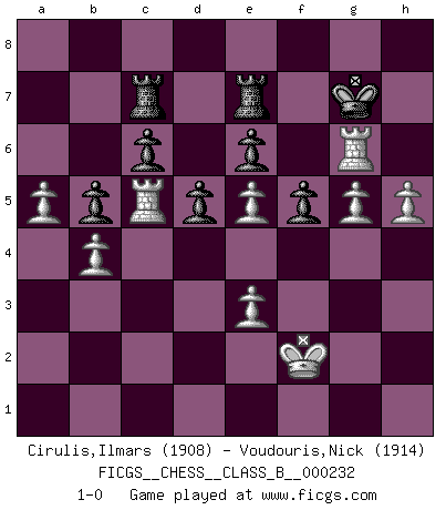 Last move : 1-0 2016 February 12 14:44:32 [Event "FICGS__CHESS__CLASS_B__000232"] [Site "FICGS"] [Date "2015.10.19"] [Round "1"] [White "Cirulis,Ilmars"] [Black "Voudouris,Nick"] [Result "1-0"] [WhiteElo "1908"] [BlackElo "1914"] 1.b4 e6 2.a3 d5 3.e3 f5 4.Bb2 Nf6 5.Nf3 Bd6 6.c4 c6 7.c5 Bc7 8.d4 Nbd7 9.Bd3 O-O 10.O-O Ne4 11.Be2 Qf6 12.Nbd2 b6 13.Rb1 Bb7 14.Qc1 Rab8 15.cxb6 axb6 16.Qc2 Qe7 17.Rfc1 Ra8 18.Ra1 b5 19.Nb3 Ndf6 20.Rf1 h5 21.Nc5 Nxc5 22.Qxc5 Qe8 23.Ne5 h4 24.Rfc1 Ne4 25.Qc2 h3 26.g3 Bxe5 27.dxe5 Qg6 28.Bd4 Ra4 29.Bd1 Rfa8 30.f3 Ng5 31.Qd3 R4a6 32.Bc5 Bc8 33.Rc2 Bb7 34.Rca2 Ra4 35.Qf1 R4a6 36.a4 Qh6 37.a5 Qh8 38.Rd2 g6 39.Ra3 Qg7 40.Rd4 Nh7 41.Rh4 Nf8 42.f4 Nd7 43.Rc3 Nxc5 44.Rxc5 Bc8 45.Qxh3 Bd7 46.g4 R6a7 47.Rh6 Be8 48.Bf3 Rf7 49.Qh4 Rc8 50.Qg5 Re7 51.h4 R8c7 52.Kf2 Bf7 53.gxf5 gxf5 54.Bh5 Qxg5 55.Bxf7+ Rxf7 56.fxg5 Rfe7 57.h5 Kg7 58.Rg6+ 1-0 Polish (Sokolsky) opening Kingside Castling by player Black (move 9) Kingside Castling by player White (move 10) Player White won this chess game. Follow this game move after move (download)Chess is really ninety nine percent calculation. (Soltis) Das typische an einem Großmeister ist, daß er eine gewonnene Position schnell und schmerzlos gewinnt. (Irving Chernev) Yo nunca en mi vida he jugado la Defensa Francesa, que viene siendo la más aburrida de todas las Aperturas. (Wilhelm Steinitz) Le moment que je préfère le plus dans une rencontre, c'est celui où je sens que la personnalité de l'adversaire se brise. (Robert Fischer) I would love to change the world, but they won't give me the source code. (Unknown)