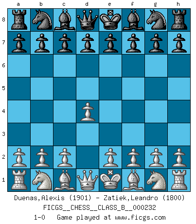 Last move : 1-0 2015 October 19 20:56:23 [Event "FICGS__CHESS__CLASS_B__000232"] [Site "FICGS"] [Date "2015.10.19"] [Round "1"] [White "Duenas,Alexis"] [Black "Zatiek,Leandro"] [Result "1-0"] [WhiteElo "1901"] [BlackElo "1800"] 1.d4 1-0 George Jempty This is bullshit Queen's pawn Player White won this chess game. Follow this game move after move (download)On the chessboard, lies and hypocrisy do not survive long. (Emanuel Lasker) Mein Name ist Rustam Kamsky. Sie haben meinen Sohn belästigt. Bereiten Sie sich aufs Sterben vor. (Rustam Kamsky) Yo siempre he tenido un ligero sentimiento de lástima por una persona que no tiene conocimiento del Ajedrez. (Siegbert Tarrasch) Je crois qu'il existe des manières très spécifiques de jouer efficacement contre une machine. Evidemment, nous n'avons aucune chance en technique pure, parce que l'ordinateur calcule de manière parfaite. Mais lorsque nous faisons appel à notre cerveau, en utilisant l'intuition et la compréhension, alors nous restons beaucoup plus forts. (Anatoli Karpov) The best teachers teach from the heart, not from the book. (Author unknown)