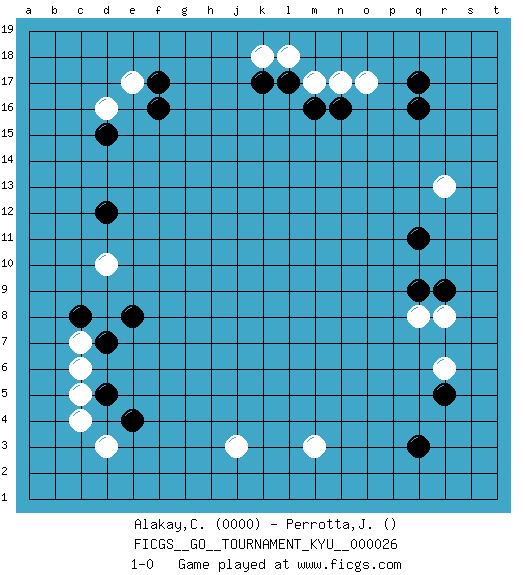 Last move : 1-0 2007 May 22 22:39:17 [Event "FICGS__GO__TOURNAMENT_KYU__000026"] [Site "FICGS"] [Date "2007.03.14"] [Round "1"] [Black "Alakay,Canbek"] [White "Perrotta,John Zach"] [Result "1-0"] [Rating 1 "0000"] 1.q16 c4 2.q3 d16 3.q9 o17 4.q17 j3 5.f17 e17 6.f16 d10 7.e4 d3 8.d5 c5 9.d7 c7 10.c8 c6 11.e8 m3 12.d15 r6 13.r5 r8 14.r9 q8 15.q11 r13 16.n16 n17 17.m16 m17 18.l17 l18 19.k17 k18 20.d12 1-0 This go game has been lost on time (started : 2007.03.14 5:49:3) Here are the names of the openings (joseki) played in the four corners : Corner q16 : q16 o17 Hoshi (Hwajeom, Seongjeom, Xingwei`) 4-4 Point. The star or hoshi (4-4) point, emphasizing influence at the potential expense of territory. Ikken Kakari (Hankan Keolch'im, Yi Gua`jiao~, 1-Space Low Approach). White 2 is the standard approach move to the 4-4. Corner d16 : d16 f17 Hoshi (Hwajeom, Seongjeom, Xingwei`) 4-4 Point. The star or hoshi (4-4) point, emphasizing influence at the potential expense of territory. Ikken Kakari (Hankan Keolch'im, Yi Gua`jiao~, 1-Space Low Approach). Black 2 is the standard approach move to the 4-4. Player Black won this Go (weiqi, baduk) game. Follow this game move after move (download)Avoid the plate connection. (Anonymous) The best weapon against an enemy is another enemy. (Friedrich Nietzsche)