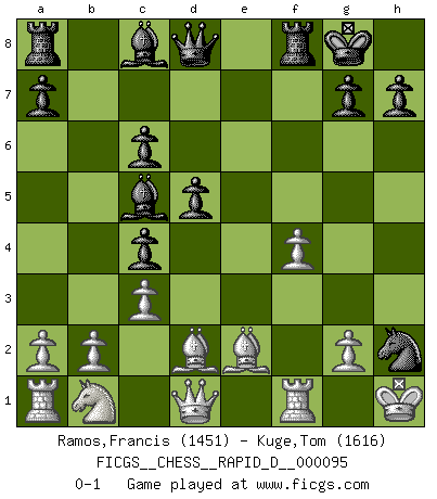 Last move : 0-1 2015 October 28 18:16:56 [Event "FICGS__CHESS__RAPID_D__000095"] [Site "FICGS"] [Date "2015.10.21"] [Round "1"] [White "Ramos,Francis"] [Black "Kuge,Tom"] [Result "0-1"] [WhiteElo "1451"] [BlackElo "1616"] 1.e4 e5 2.Nf3 Nf6 3.d4 exd4 4.e5 Ne4 5.Qxd4 d5 6.Be3 c5 7.Qd1 Be7 8.Bd3 f5 9.exf6 Nxf6 10.O-O O-O 11.Ne5 Nc6 12.Nxc6 bxc6 13.c3 Ng4 14.Bd2 Bd6 15.f4 c4 16.Be2 Bc5+ 17.Kh1 Nxh2 0-1 Petrov : Modern attack, Main line Kingside Castling by player White (move 10) Kingside Castling by player Black (move 10) Player Black won this chess game. Follow this game move after move (download)It is the aim of the modern school, not to treat every position according to one general law, but according to the principle inherent in the position. (Richard Reti) Sicherlich können nur Meister einen Stil haben. Daß ein nicht-Meister auch nur ein einziges Mal in seinem Leben eine Partie folgerecht durchführte, habe ich niemals bemerkt. (Emanuel Lasker) El Rey es una pieza de pelea. ¡Usenlo!. (Wilhelm Steinitz) Un footballeur joue avec ses pieds, parfois avec sa tête. Un joueur d'échecs ne joue qu'avec sa tête. Et quand il ne joue plus, il meurt. (Jacob Murray) The intuitive mind is a sacred gift; the rational mind is a faithful servant. We have created a society that honors the servant but has forgotten the gift. (Albert Einstein)
