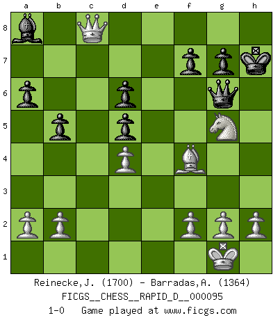 Last move : 1-0 2015 December 3 22:8:54 [Event "FICGS__CHESS__RAPID_D__000095"] [Site "FICGS"] [Date "2015.10.21"] [Round "1"] [White "Reinecke,Jurgen"] [Black "Barradas,Anderson"] [Result "1-0"] [WhiteElo "1700"] [BlackElo "1364"] 1.e4 e5 2.Nf3 Nc6 3.Bb5 a6 4.Ba4 Nf6 5.O-O b5 6.Bb3 Bc5 7.c3 O-O 8.d4 exd4 9.cxd4 Bd6 10.e5 Be7 11.exf6 Bxf6 12.Nc3 Bb7 13.Be3 Ne7 14.Rc1 c6 15.Ne4 Nd5 16.Bxd5 cxd5 17.Nxf6+ Qxf6 18.Re1 d6 19.Rc7 Rab8 20.Bg5 Qg6 21.R1e7 h6 22.Bxh6 Ba8 23.Bf4 Rbc8 24.Qc1 Rxc7 25.Rxc7 Re8 26.Rc8 Rxc8 27.Qxc8+ Kh7 28.Ng5+ 1-0 Ruy Lopez : 5.O-O Kingside Castling by player White (move 5) Kingside Castling by player Black (move 7) Player White won this chess game. Follow this game move after move (download)We don't really know how the game was invented, though there are suspicions. As soon as we discover the culprits, we'll let you know. (Bruce Pandolfini) Ich spiele 70 Eröffnungssysteme. (Viktor Kortschnoi) ¿Esta Bobby Fischer algo cuerdo?. (Salo Flohr) Un millionnaire : 'Monsieur Steinitz ! Vous ne participez aux tournois que pour l'argent, alors que moi je n'y viens que pour l'honneur.' Steinitz : 'Chacun joue pour ce qu'il n'a pas'... The beginning of wisdom is silence. The second step is listening. (Unknown)