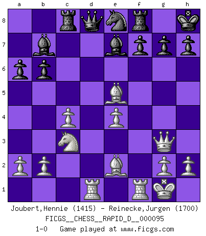 Last move : 1-0 2015 November 30 1:51:17 [Event "FICGS__CHESS__RAPID_D__000095"] [Site "FICGS"] [Date "2015.10.21"] [Round "1"] [White "Joubert,Hennie"] [Black "Reinecke,Jurgen"] [Result "1-0"] [WhiteElo "1415"] [BlackElo "1700"] 1.e4 c5 2.Nf3 e6 3.d4 cxd4 4.Nxd4 a6 5.c4 b6 6.Nc3 d6 7.Be3 Bb7 8.Be2 Nf6 9.f3 Be7 10.O-O O-O 11.Rc1 Nc6 12.Qe1 Nxd4 13.Bxd4 Rc8 14.Qg3 Kh8 15.f4 e5 16.fxe5 dxe5 17.Bxe5 Ne8 18.Rcd1 1-0 Sicilian : Kan, Maroczy bind (Reti variation) Kingside Castling by player White (move 10) Kingside Castling by player Black (move 10) Player White won this chess game. Follow this game move after move (download)There are two types of sacrifices: correct ones and mine. (Mikhail Tal) Im Reiche der Wirklichkeit ist man nie so glücklich wie im Reiche der Gedanken. (Arthur Schopenhauer) La enorme capacidad mental, en la que sin ella no puede un jugador de Ajedrez existir, es demasiado requerida por el Ajedrez al grado de que nunca podrá liberar su mente de este juego. (Albert Einstein) La vérité est comme le meilleur coup aux échecs : elle existe, mais il faut la chercher. (Arturo Perez-Reverte) Life is pain my dear and anyone who says otherwise is selling something. (Princess Bride)